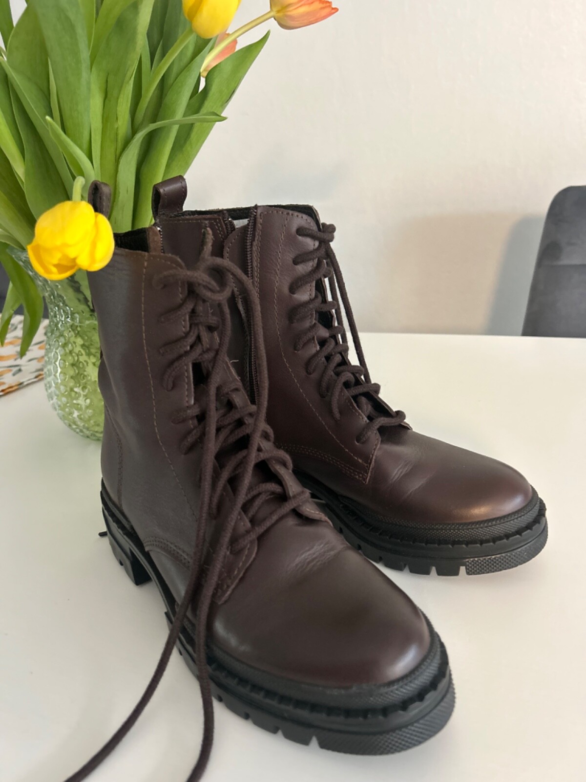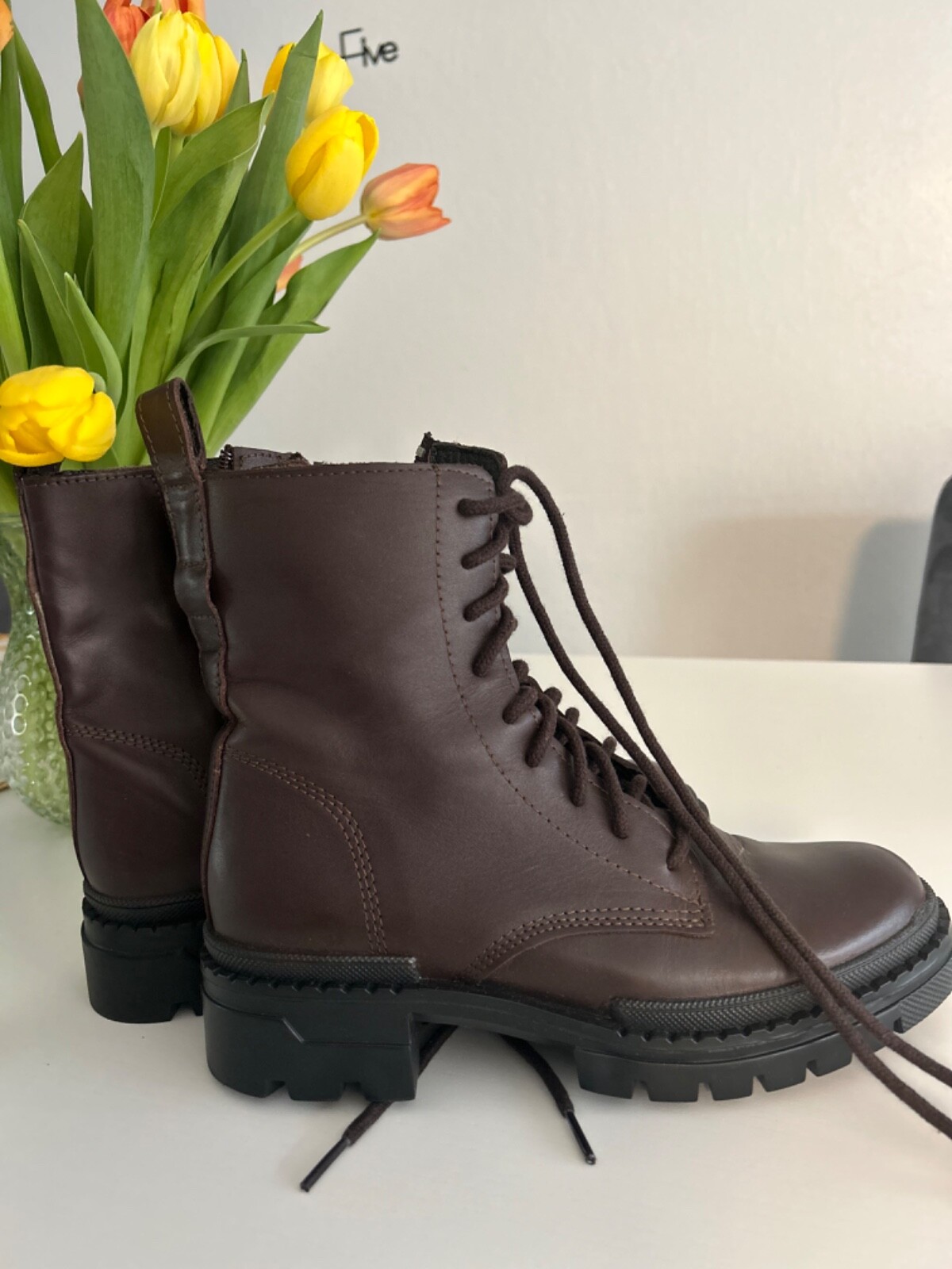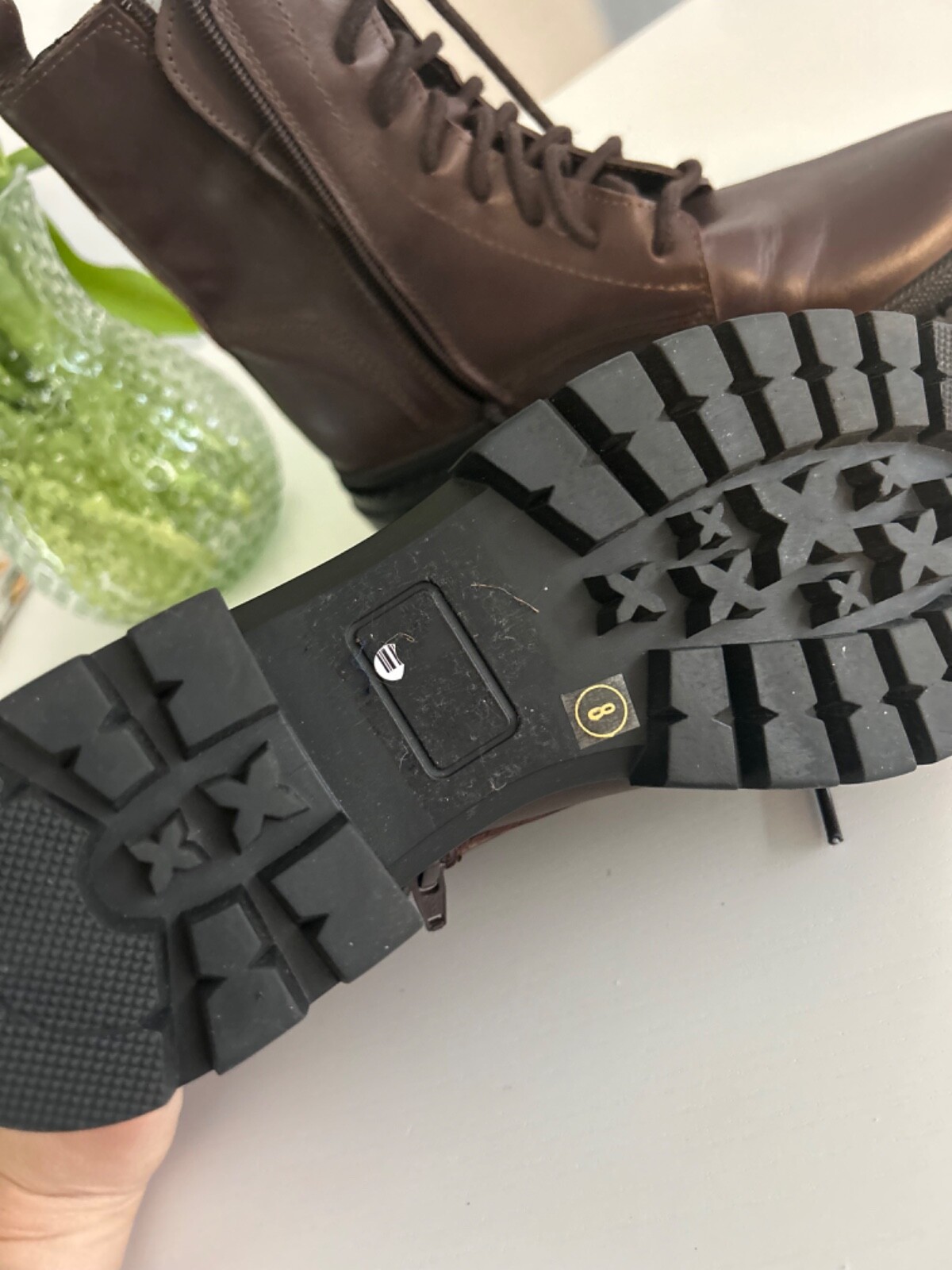 Steve Madden Jamisyn Lace-Up Combat Boot Brown Size 8 1-1/2" block heel; 1" platform Round-toe lace-up combat booties with inner ankle zipper closure Steve Madden Women's Jamisyn Lace-Up Leather Boot in Brown with Nice YKK Side Zip Closure Design ~ A trendy lugged sole grounds this lace-up boot with classic combat styling :
