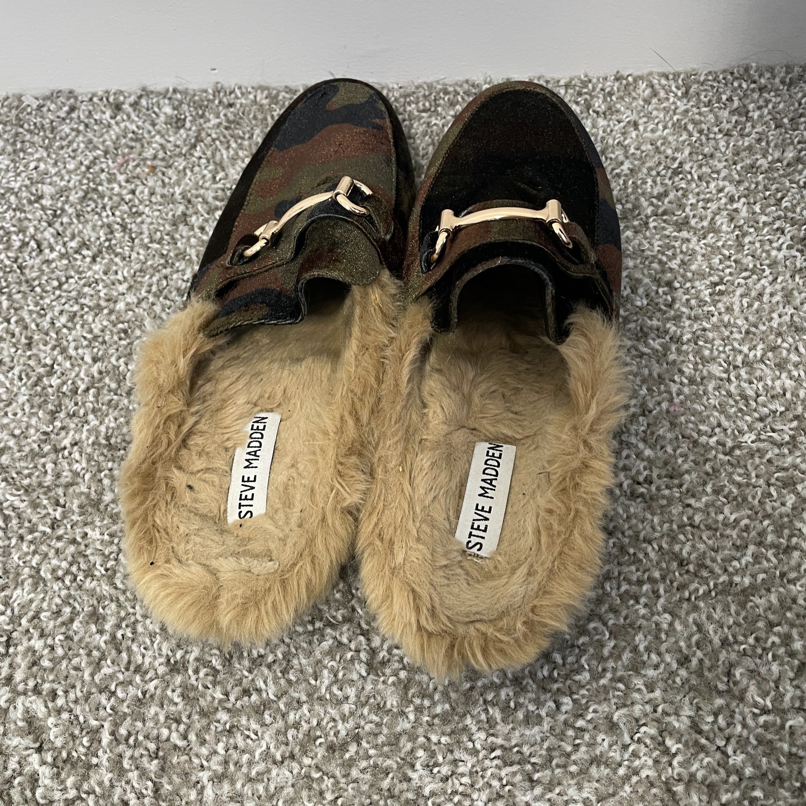 Steve Madden Jill Camo Faux Fur Mule Loafers Slippers Women's 9 Slip On Horsebit