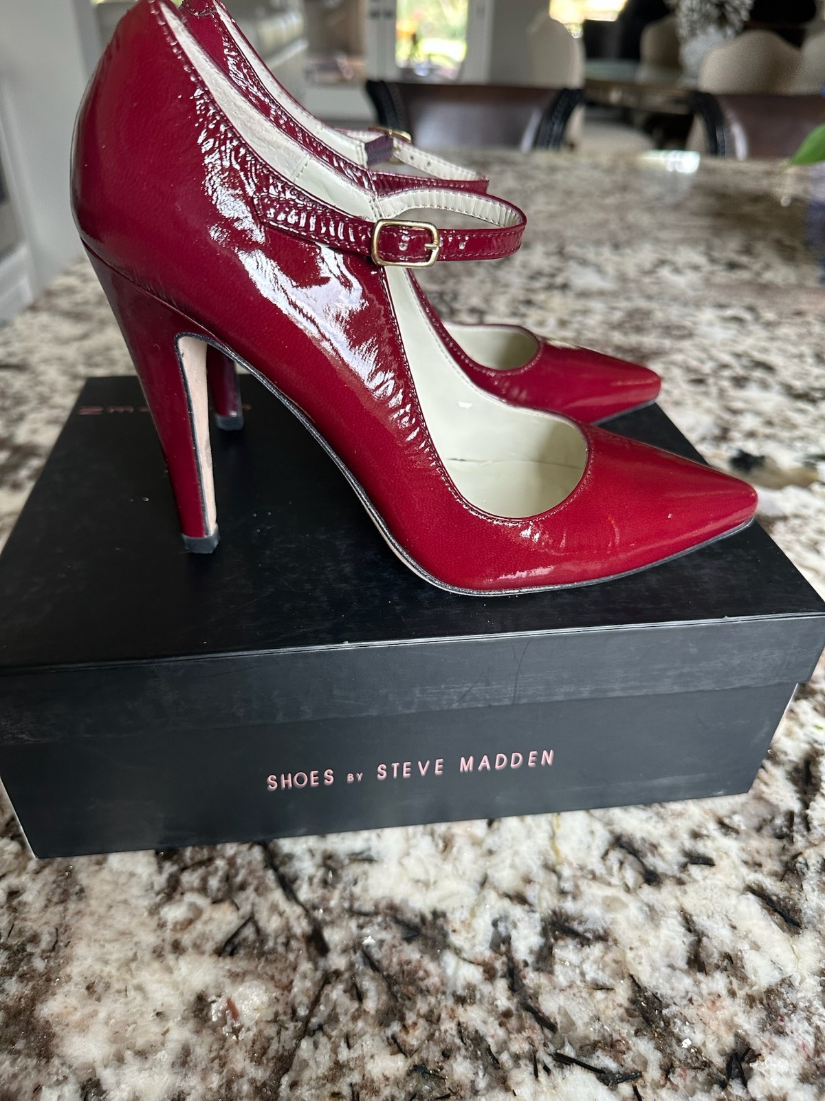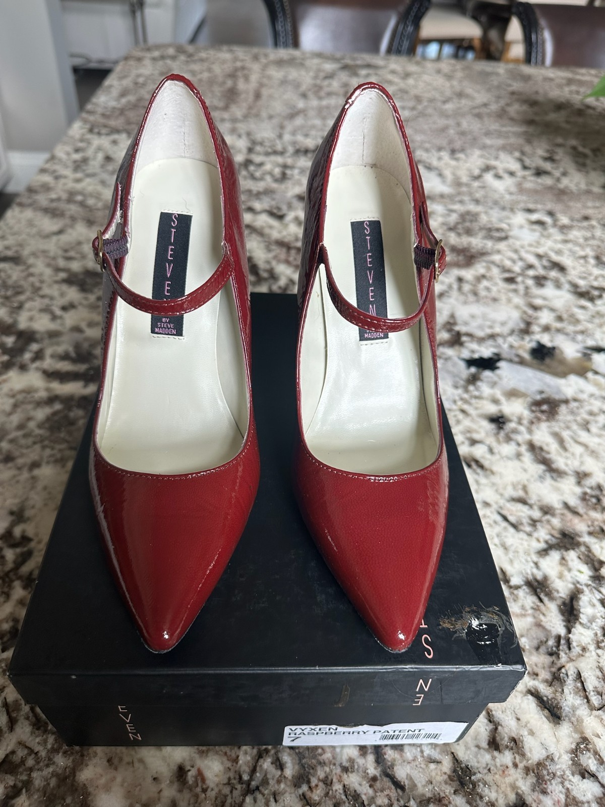 Women's Steven by Steve Madden Vyxen Patent Leather Heels Never worn, has original box, bottoms have a bit of dirt from being tried on Size 7M Dark Red (Raspberry) Patent Leather uppers with leather insoles and bottoms. These shoes are vintage but still look current! They are beautiful! Heel height measures to be 4.5". They have a mary jane type strap across the foot and a pointy toe. They have an extra set of heel taps included.