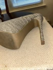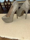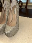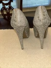 This product is a pair of Steve Madden women's heels in size 7.5, featuring a sleek stiletto design with divine rhinestone accents. The silver color and leather upper material add a touch of elegance to the pump style heels, making them a stylish and eye-catching choice for any special occasion. Perfect for those looking to add a touch of glamour to their outfit with a comfortable and sophisticated shoe option.