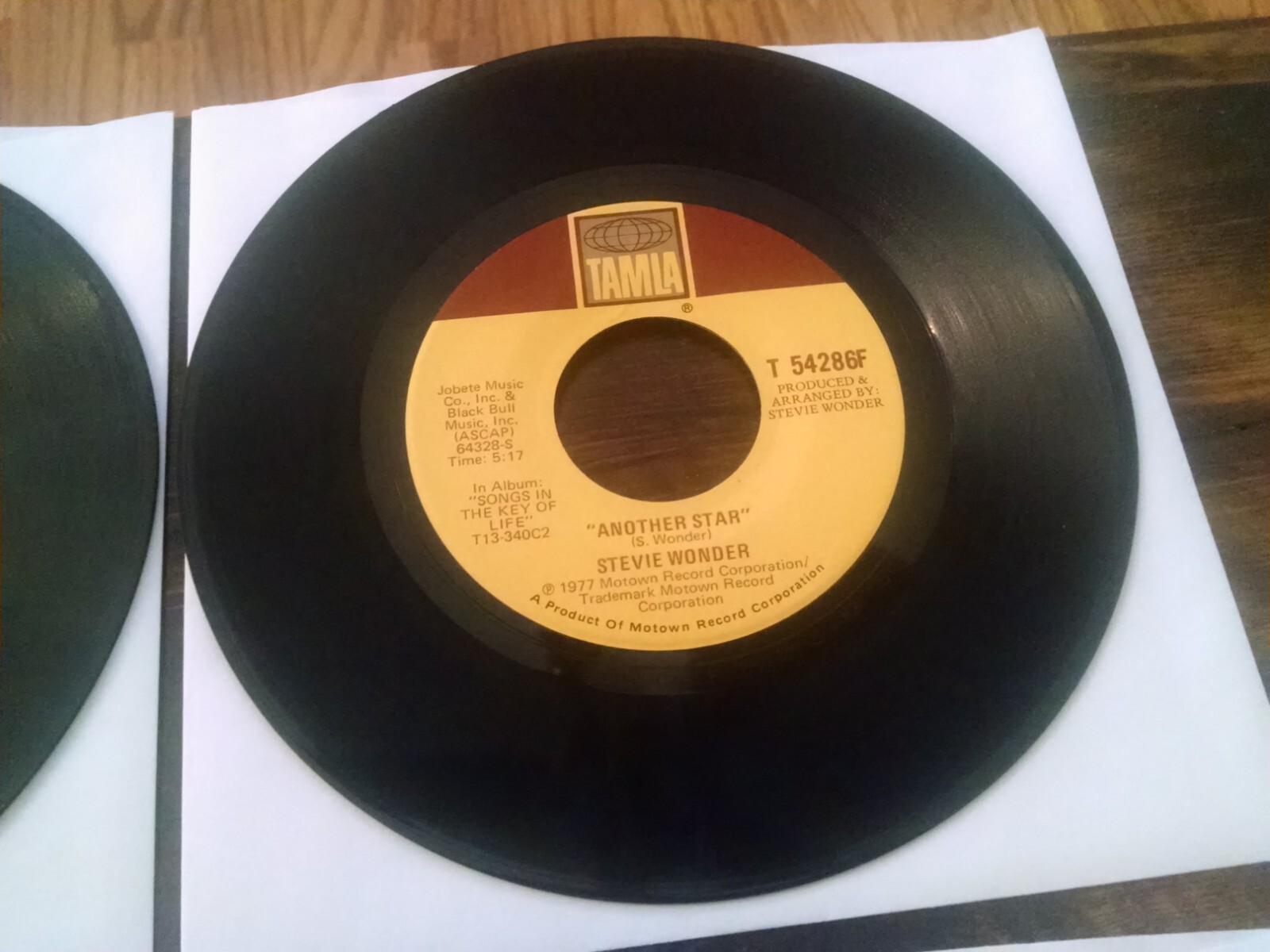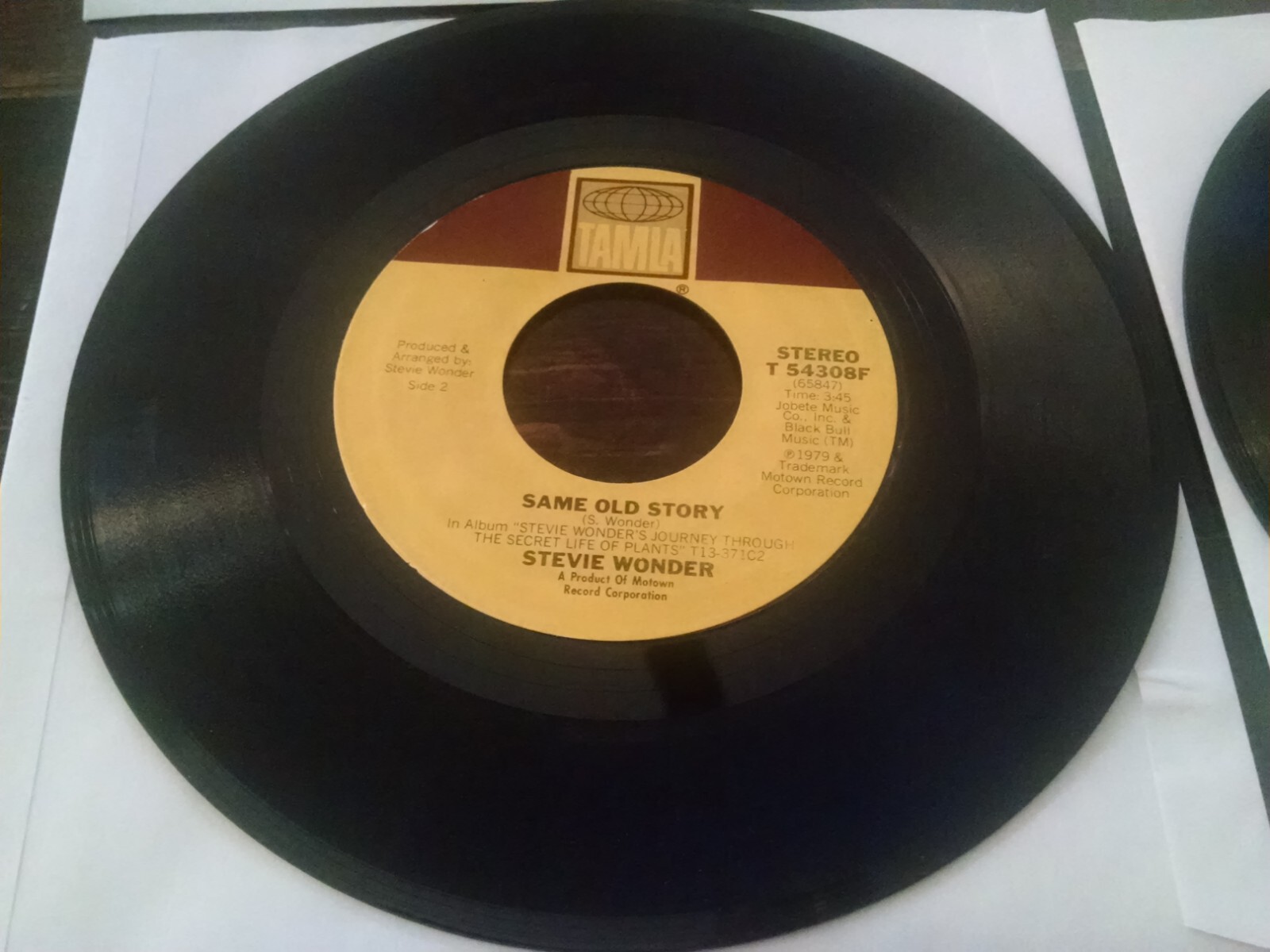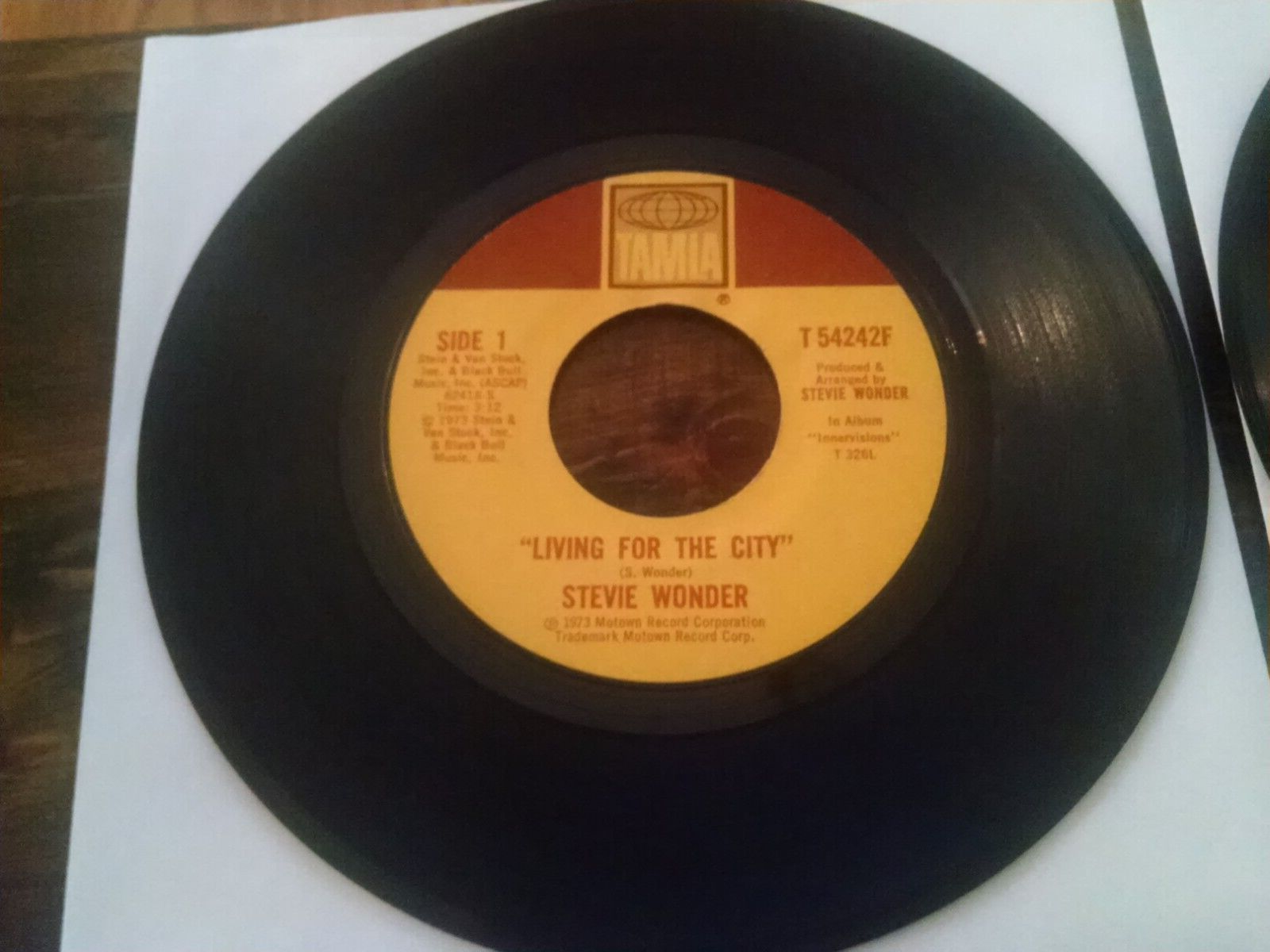 This lot includes four 45 RPM records by Stevie Wonder, featuring the hits "Living for the City," "Sir Duke," "Same Old Story," and "Another Star." The records are in paper sleeves and made of vinyl, with a record grading of Very Good (VG) and a sleeve grading of Good (G). These records are perfect for any Motown or R&B & Soul genre collector. The release year of these records is 1976, making them a great addition to any vintage music collection. #49