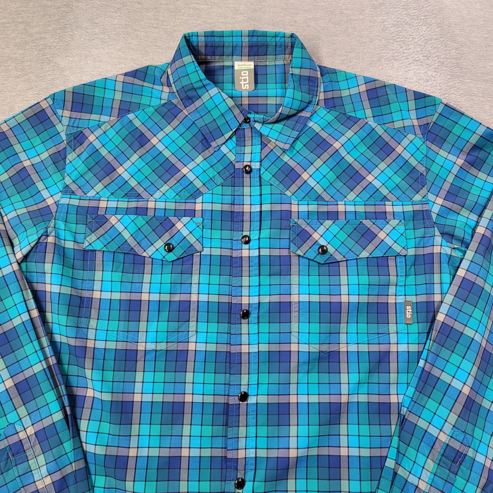 The Stio Men's Medium Blue Check Button-Up Shirt is a classic fit shirt with a stylish blue check pattern. Featuring a collared neckline and long sleeves, this shirt is perfect for casual occasions. The flap pockets add a touch of sophistication to this versatile piece, making it suitable for everyday wear. Made from a blend of polyester and nylon, this shirt offers comfort and style for the modern man.