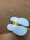 The Stitch Crocs are a pair of women's athletic closure. They feature a solid blue color with the character Stitch, making them a fun and stylish choice for casual occasions. Made with a vinyl upper and synthetic lining, these Crocs offer comfort and a standard shoe width for a comfortable fit. The rubber outsole provides durability and traction for walking activities, making them a versatile option for the spring season.