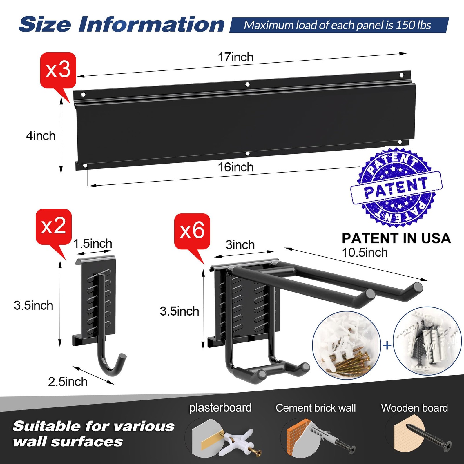 Garage Tool Storage Rack Perfect Fit: The 17" total length of the slot board and 16" distance between the outermost two holes are designed to perfectly fit the standard 2"x4" stud spacing in American homes, ensuring the hanging point is in the center of the wooden board for maximum stability. The hooks are rubber-coated (protect your tools from slid and damage) and removable, you can customize the spacing between the attachments on the 51" steel rail (3 panels) to meet your needs. Multiple Mounting Options and Easy Install: It includes 2 types of screws for different wall types: self-tapping screws and expansion tubes for brick walls, self-tapping screws for wood walls, and wall anchors for gypsum board walls. The kit comes with pre-drilled tracks and screws. Before mounting the rack, mark the position of the rail to ensure that it is parallel to the horizontal. Once marked, simply attach the rack to the wall studs using the included anchors and fasteners. Heavy-Duty Construction: Made with high-strength steel with powder-coated, this garage storage organizer can support up to 450 lbs, making it perfect for heavy tools and equipment. Resists rusting, chipping and cracking. Comes with 3 slot boards and 8 hooks, providing ample storage space for bikes, sports equipment, chairs, garden tools, shovels rakes, brooms, mops, extension cords, hoses, power tools, and other sporting equipment such as helmets, boots, ice skates, hockey sticks, ski gears etc. Convenient Access: The organizer's design also makes it incredibly convenient to store and access your tools. The hooks are positioned at a variety of heights and angles, so you can easily find the tool you need without having to search through a cluttered toolbox or drawer. Plus, the system is easily expandable, so you can add more hooks or even additional storage components as your needs change over time. Customer Service: The Garage Storage Organizer is a versatile and practical solution for anyone looking to get their workspace organized and clutter-free. Whether you're a DIY enthusiast or a professional mechanic, the Garage Storage Organizer is the perfect solution for organizing your garage, workshop, or storage space. If you are not satisfied with the wall mount tool organizer, just send an email to us, you'll get refunded to you, no questions asked.