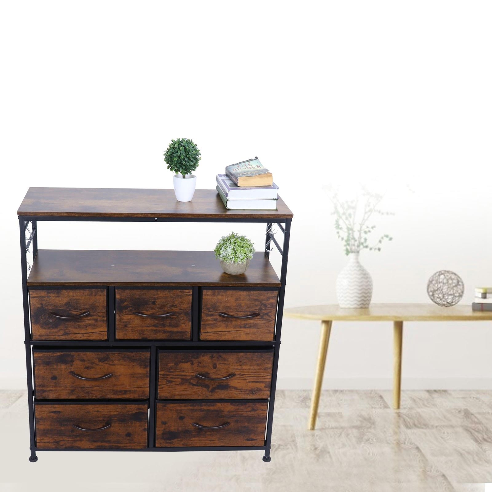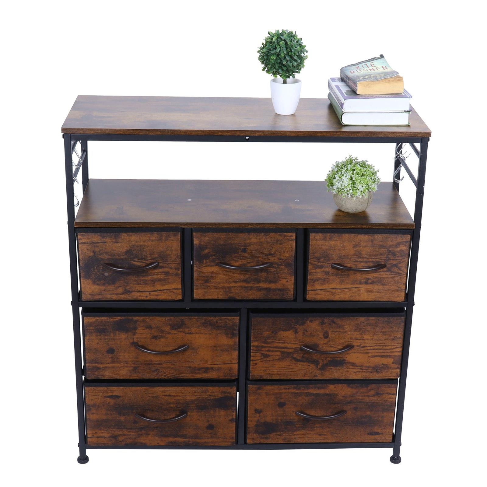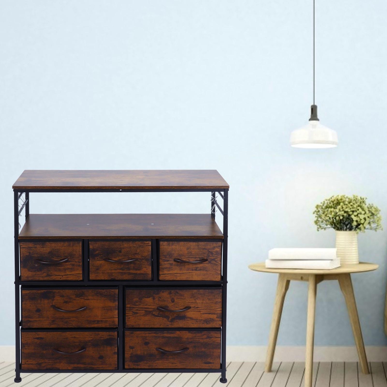 Featrues: 1、The fabric texture on the front of the drawer has a warm brown color and looks rustic. 2、The frame and top handle are metal tubes, which are very cool. Durable and not easily damaged. 3、It can be moved and can be placed in the hallway, living room or bedroom. Convenient to place objects. 4、This cabinet can hold many things and is suitable for different scenes. It can be used as a storage area for the dressing table in the bedroom, living room, nursery, bathroom, etc. 5、Industrial style, fit for various styles of houses. Installation is simple and no other tools are required. Specification: Item Type: Dressing Table Material: Steel + Particle Board + Non-Woven Fabric Weight: Approx. 13050g / 460.3oz Size: Approx. 85x80x29.5cm / 33.5x31.5x11.6in Color: Antique Tan Features: Industrial style, with seven non-woven drawers, two-layer partitions, and hooks on both sides. How to Use: 1. Open the product package and confirm the position of each part 2. Follow the product instructions and install them in sequence 3. Tighten the fixing screws to see if the installation is firm Package_list: 1 x Cloth Drawer Kit 5 x Installation Screw Pack 1 x Hex Wrench 1 x Screwdriver 8 x Hook 7 x Handle 4 x Foot Protector 1 x Installation Manual