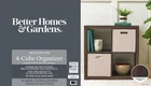 Storage Organizer 4-Cube Shelves Compartments Boxes Decor Display Gray Openback Add function and style to your home with the Homes & Gardens 4-Cube Storage Organizer. Available in multiple finishes, solid and wood grain options, this cube organizer features four 13" x 15" x 13" compartments, perfectly sized for displaying books, collectibles, photography, artwork, storage bins, and baskets. The open-back design makes it easy to manage the cords and cables of electronic devices. The top panel of this sturdy bookcase can support up to 100 lbs and each cube space supports up to 30 lbs. Combine it with other Better Homes & Gardens cube organizers and storage bins (sold separately) to create a complete storage and display system. Easy to assemble with included instructions, the Better Homes & Gardens 4-Cube Storage Organizer is perfect for your office, living room, den, playroom, and more. - Sleek, open-back design for easy cord management - Features four 13" x 15" x 13" compartments - The top panel can support up to 100 lbs, and each cube supports up to 30 lbs - Dimensions: 30.16" W x 15.35" D x 29.84" H - Weight: 31.7 lbs - Materials: MDF, particleboard, paperboard, and iron - Can be combined with other Better Homes & Gardens Storage Organizers and Shelves (sold separately) - Easy to assemble with included instructions and video assembly guide - Tools required: hammer - Package dimensions: 18.11" x 34.49" x 8.58" - Package weight: 37.47 lbs Hello and Greetings! Providing quality items for you is our goal. We do our best to make every customer satisfied with their transaction from beginning to end. If you have any questions please feel free to ask as we will do our best to answer you as quickly as possible. We are here to make your buying experience as pleasurable as possible :) Thanks for stopping by & shopping here!