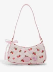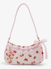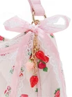 Keep your essentials in a berry sweet shoulder bag! This Strawberry Shortcake purse features a quilted fabric with strawberries all over, plus an appliqué of Strawberry Shortcake at the corner and Custard on the back. Comes with lace ribbon details and strawberry charms. Interior drop pocket. 10" x 2" x 5" Polyester; polyurethane Interior drop pocket Bag charm