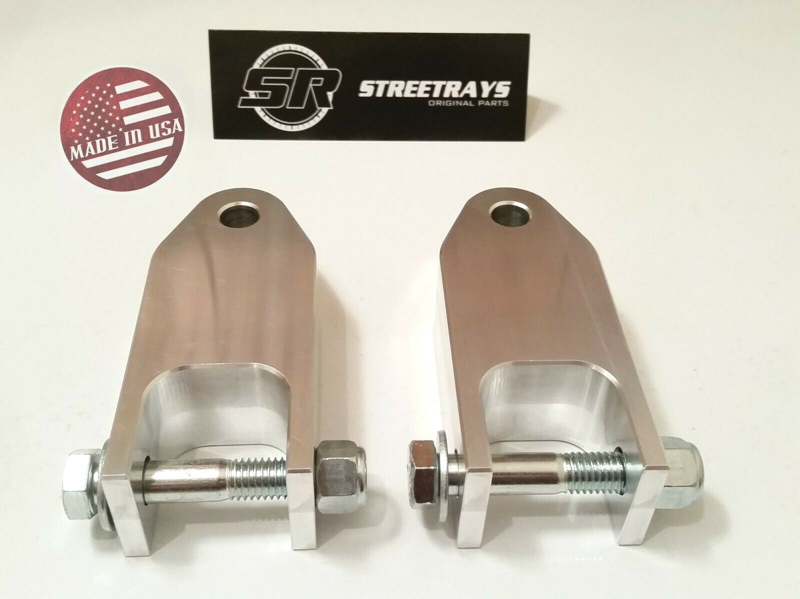 StreetRays [Originals] Chevy / GMC 1500 & 2500 Truck Front / Rear Shock Extenders 4" Bilstein Rancho CNC Machined Finished (All Around) Application: Chevy Silverado / GMC Sierra 1500 & 2500 Truck 2WD & 4WD Will work for 4" lift to 6" lift Max This kit is confirmed to work for Rear shocks but we have found that it does work with Front shocks too for most Chevy / GMC 1500 & 2500 models. Our Kit Includes: 2 x CNC Machined Rear shock bracket 2 x Highest Grade Set of Nuts & Bolts (and washers) StreetRays [Originals] parts are 100% machined right! here in Central Texas. Matched with the best hardware which is also sourced here in USA. Quality material & precision machining is the main ingredients of all our parts. StreetRays [Originals] rear shock extension brackets are CNC machined out of 6061 T6 solid billet aluminum in Central Texas. The material has been tempered, so it will handle the abuse your truck will give them. Our extenders will allow customers to keep using their stock (factory) shocks even after lifting their Chevy 1500 by about 4" to 5" without any issue. Ride quality and behavior will remain very close to stock. Why spend big dollars on a set of new shocks when your factory ones are still working fine? Just because they are too short by couple of inch? This is the answer. StreetRays rear shock extender will solve exactly that problem. They can be installed within just 45 minutes or so with basic set of tools and garage Jack + Jackstands.