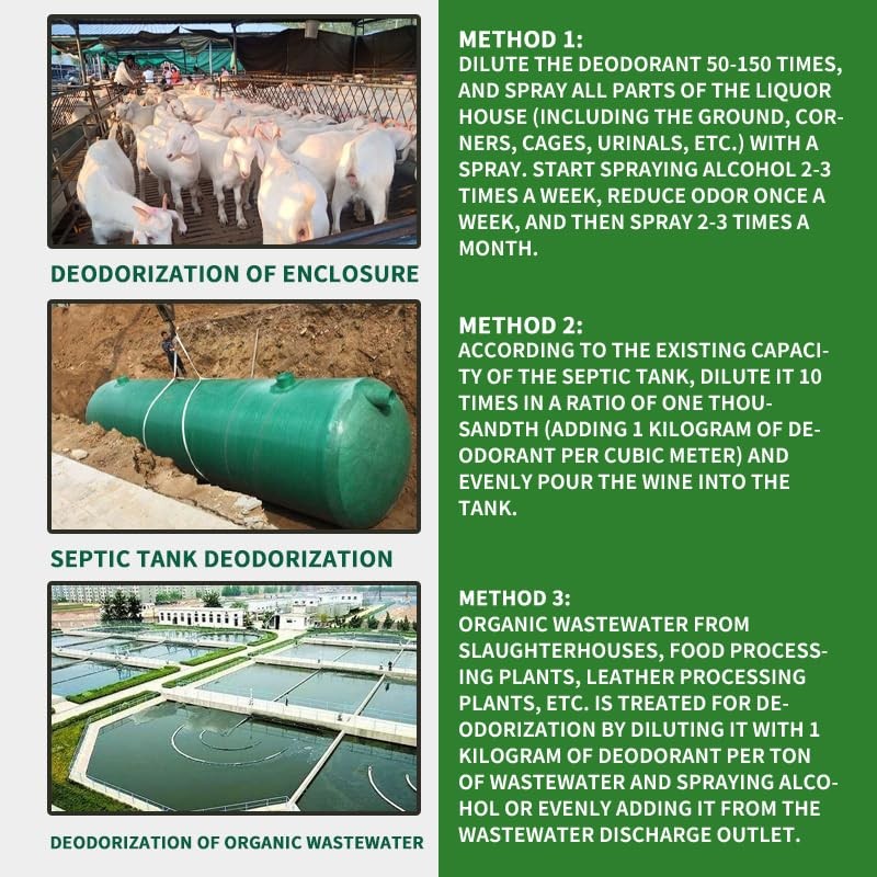 Sink Odor Eliminator, Plant Deodorizer Liquid, Trash Can Deodorizer, Osmanthus Scent Freshener Liquid - Suitable for a Variety of Smelly Places to Refresh the Air and Eliminates Odor Feature: How to use: 1. Space spray deodorization: Use spray deodorization equipment to spray deodorizer around sewage pools and garbage sites to quickly remove the odor that permeates the surrounding space. 2. Use with deodorization equipment: Add to absorption towers, water washing towers and other equipment to improve the deodorization effect. 3. Flushing method: After the product is diluted, it can be used to flush the ground, sewage residual ditches and other odorous areas. Dosage used: 1.Deodorizing the Farm: Dilute the deodorant 50-150 times and spray it evenly on all aspects of the farm (including the ground, corners, cages, excrement troughs, etc.) with a sprayer. Spray 2-3 times a week at first, until the odor subsides, you can spray once a week or 2-3 times a month. 2.Septic Tank Deodorization: According to the existing capacity of the septic tank, dilute it 10 times at a ratio of one thousandth (1 kg of deodorant per cubic meter) and pour it evenly into the tank. 3.Deodorization of Organic Wastewater: Deodorization treatment of organic wastewater from slaughterhouses, food processing plants, leather processing plants, etc., spray 1 kg of deodorant per ton of wastewater or add it evenly from the wastewater outlet. Specification: Weight: 1 KG Package include: 1 x Plant Deodorant 【Natural Deodorant】The raw materials of this air freshener are extracted from more than 30 kinds of natural herbal and flower ingredients, including mint, ginkgo leaves, grape seeds, wormwood, lotus, lavender, lemongrass, tea polyphenols, eucalyptus oil and other plants. The fragrance is fresh, natural, long-lasting and rich. 【Super Concentrated Formula】The garbage deodorizer adopts a professional deodorizing concentrated formula, which can be diluted 200 times for use. The deodorizing effect is obvious and rapid, leaving a fresh and clean osmanthus scented environment. 【Powerfully Fresh Air】Septic tank freshener can adsorb odor molecules, effectively absorb odors, change the molecules, and powerfully decompose the odor into odorless molecules, while leaving behind the fragrant osmanthus scent. 【Environmental Protection and Safety】 The raw materials of sewer deodorant are extracted from a variety of natural plant ingredients, do not contain any irritating chemicals, are friendly to the environment and animals, are environmentally friendly and safe, and can be used with confidence. 【Wide Range of Applications】This powerful deodorizer is ideal for garbage dumps, breeding farms, sewage plants, septic tanks, sewer, spray towers, slaughterhouses and other odorous places, helping to remove unpleasant odors and bring a long-lasting fresh smell.