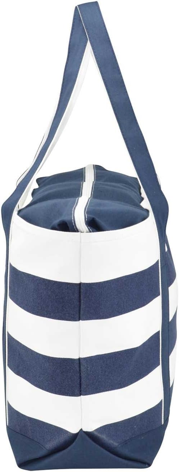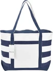This striped boat tote is perfect for summer! The navy and white canvas is sturdy yet lightweight, and the zippered top keeps everything secure. Love the spacious interior and handy outer pocket—great for beach trips, shopping, or everyday use. The cotton feels durable, and the handles are comfortable to carry. A stylish, practical bag that holds up well!