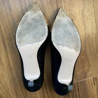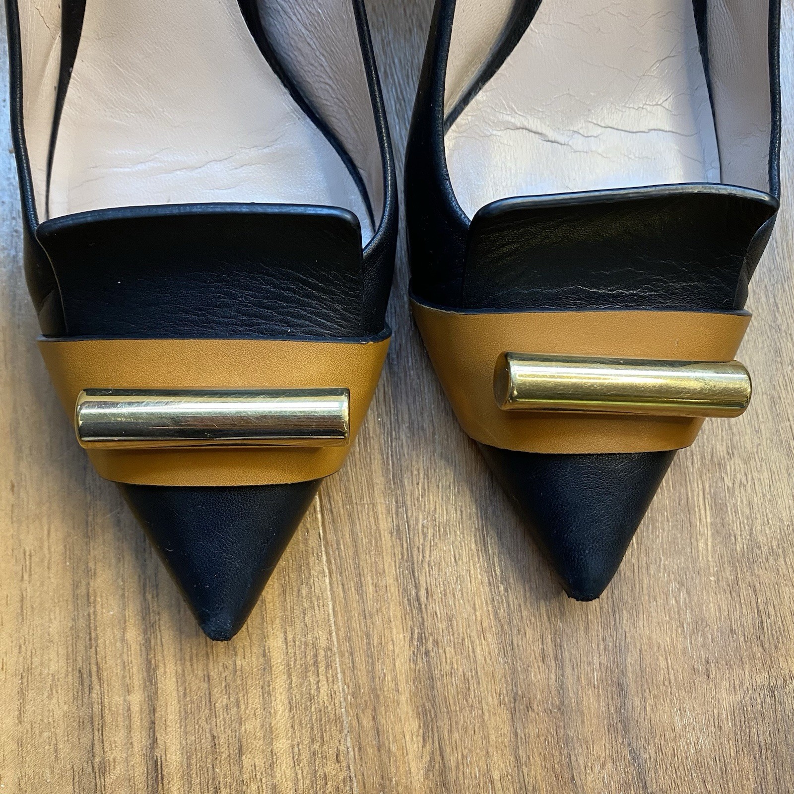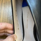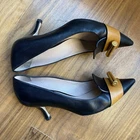 Stylish and elegant Stuart Weitzman pointed-toe heels featuring smooth black leather with a mustard-gold strap and a metal bar accent. Classic sculpted heel and premium leather construction. Beautiful statement pumps perfect for work, events, or evening wear. Condition: • Gently used, with some normal wear on soles. • Uppers look clean with minor signs of use. • Interior lining intact. • Please review photos for the exact condition. Details: • Brand: Stuart Weitzman • Size: 7.5 (code shown in photos) • Color: Black with mustard/gold accent • Material: Leather upper & leather sole • Pointed toe • Slip-on pump • Metal bar detail