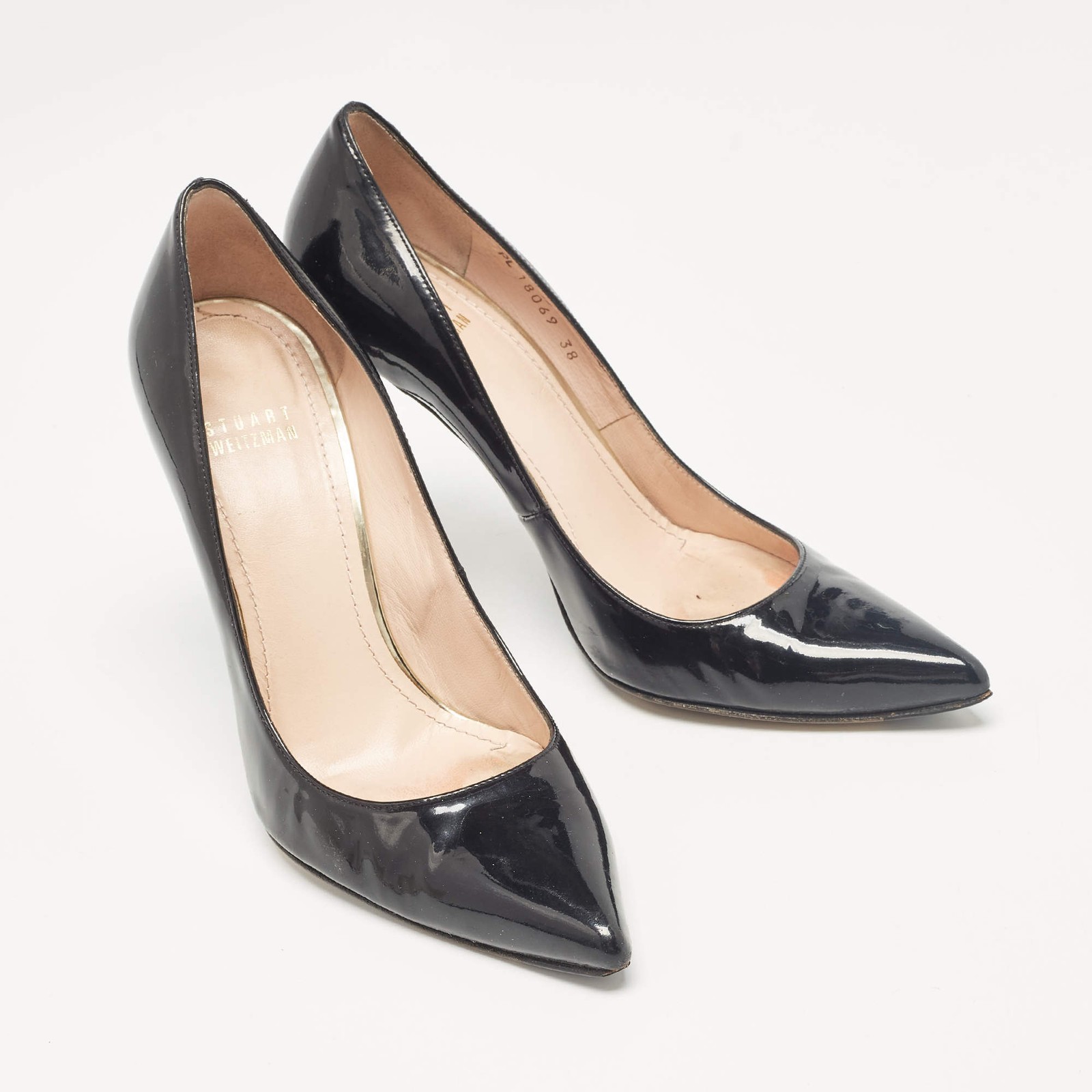 Our eBay Store About Us Contact Us Add to Favorite Sellers Stuart Weitzman Black Patent Leather Pointed Toe Pumps Size 38 Curvaceous arches, a feminine appeal, and a well-built structure define this set of designer pumps. Coming with comfortable insoles and sleek heels, style them with your favorite outfits. Product Details Brand Stuart Weitzman Color Black Includes The Luxury Closet Packaging Outsole Length 22.5 cm Outsole Width 9 cm Size 38 Certified by The Luxury Closet This item has gone through a detailed authentication process overseen by our experts. We offer a lifetime guarantee of authenticity on all our items. How We Check The in-house team of experts at The Luxury Closet is highly trained to verify the authenticity and the condition of the luxury products. They ensure that only 100% authentic items are put on sale.The evaluation process is unique with its own mix of assessment criteria and differs according to the category. Each item is evaluated based on the following combination of hallmarks, hardware, stitching, symmetry, material, craftsmanship, stamping, codes, hologram stickers, and packaging. Our authenticators also check if the items have been modified or amended (e.g., aftermarket diamonds, replaced batteries, repaired bags, etc.) International Buyers Import duties, taxes and charges are not included in the item price. These charges are the buyers responsibility. Please check with your country’s customs office to determine what these additional cost will be prior to buying.