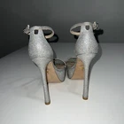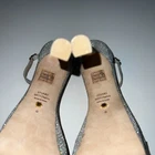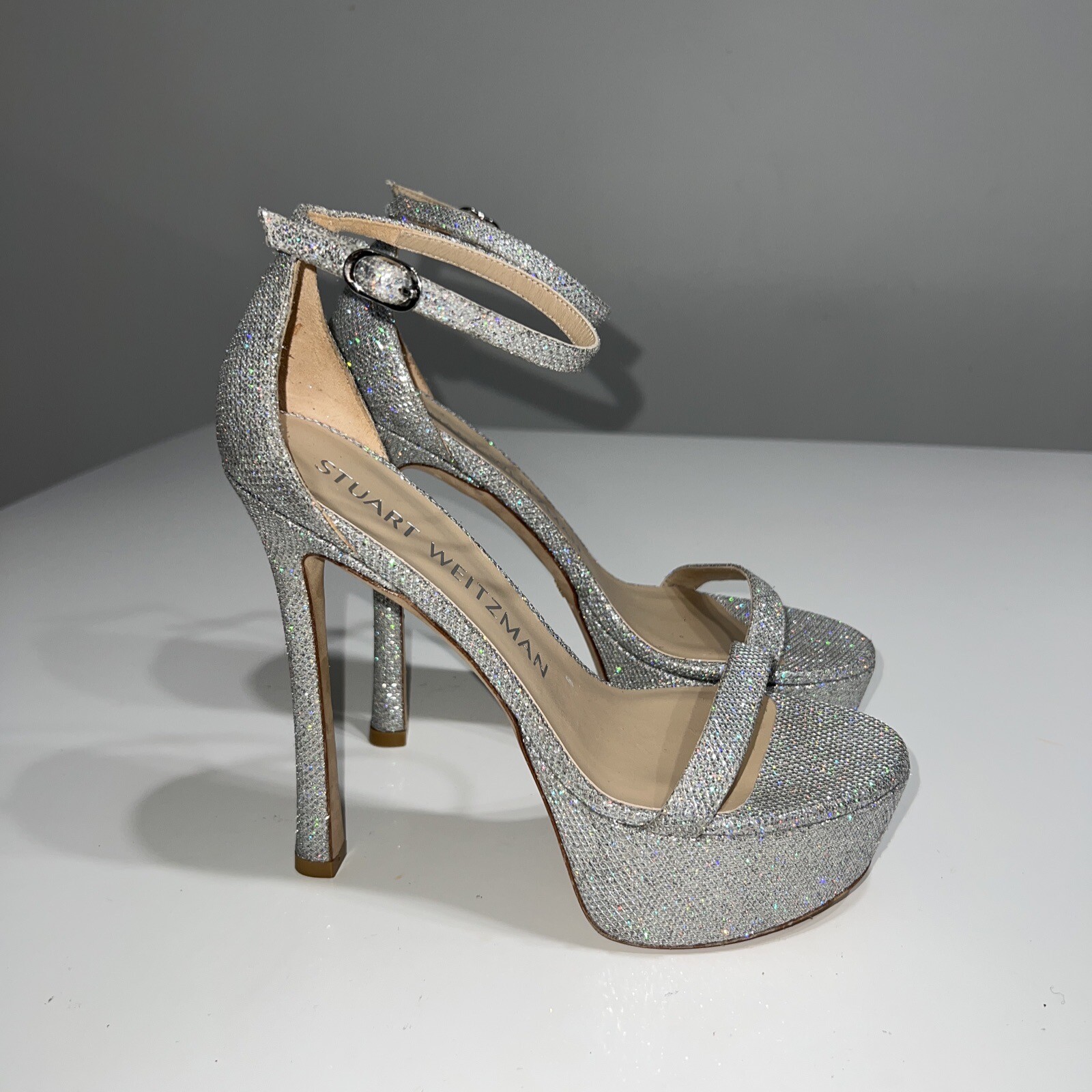 The Stuart Weitzman Disco Silver Crystal Platform Sandal in size US 8 is a glamorous and stylish shoe featuring an ultra-high stiletto heel and adjustable buckle closure. With a shiny silver glitter accents and leather upper and lining materials, these platform sandals are perfect for adding a touch of disco-inspired flair to any outfit. Made in Spain, these shoes are designed for women who want to make a statement with their footwear.