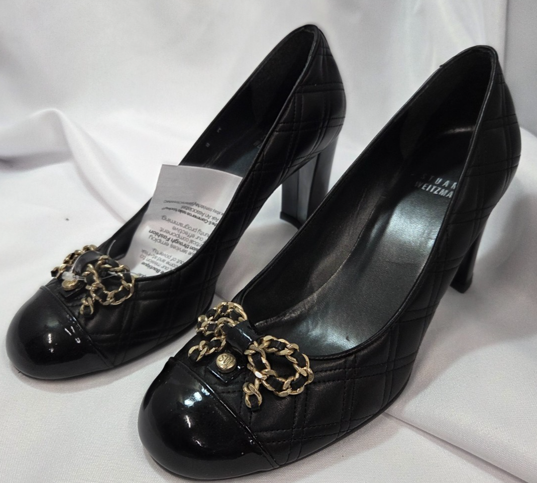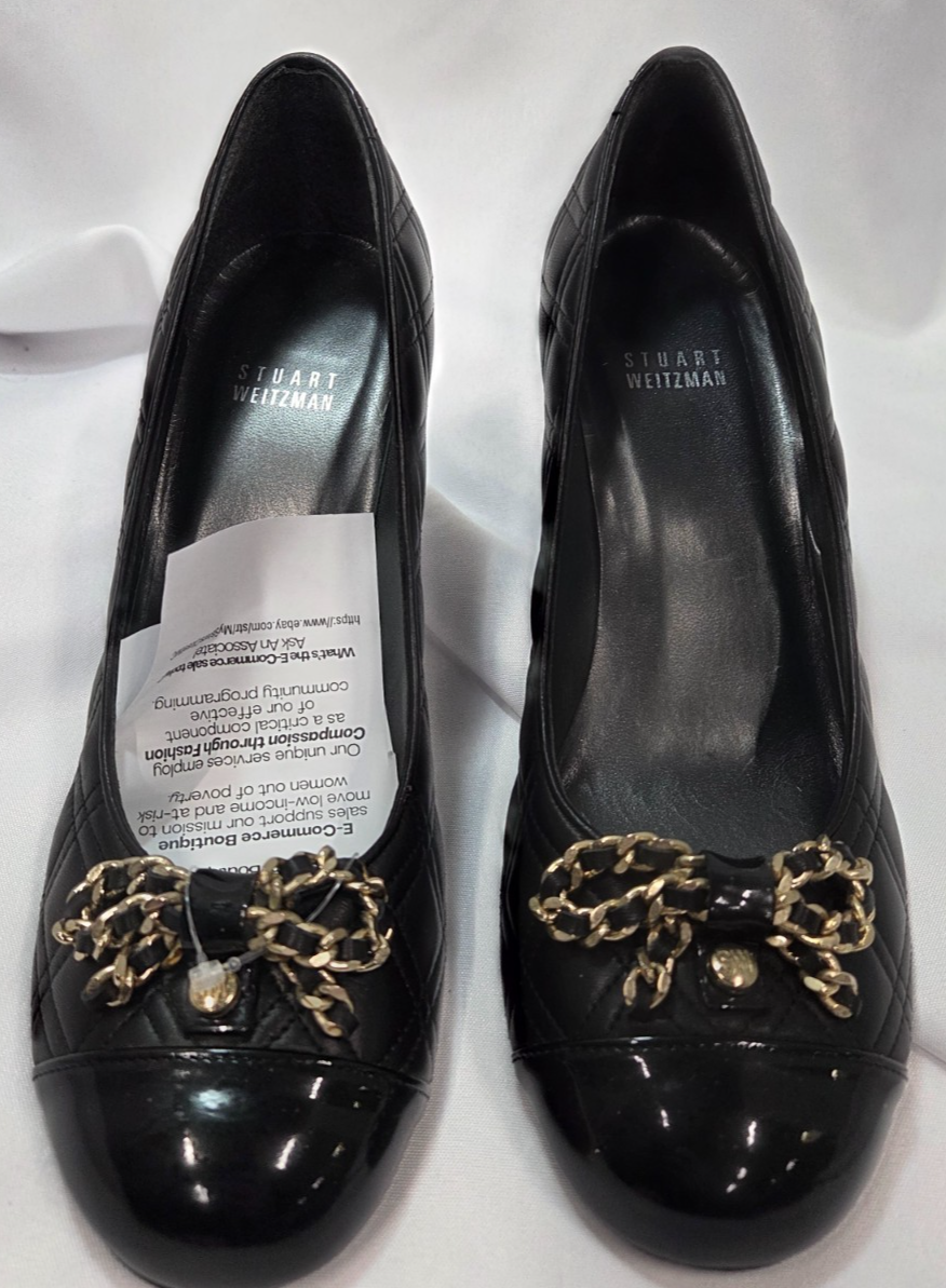 Stuart Weitzman Quantas Quilted Black Leather Pumps Size 8 Brand: Stuart Weitzman Overall Condition: Excellent condition. See pictures for details. Materials: Leather, rubber, man made materials. Shipped with USPS Priority, Flat Rate or, when possible, First Class Mail. Description: Stuart Weitzman Quantas quilted black leather pumps are elegant, slip-on high-heeled shoes crafted from soft Nappa leather, featuring a distinctive quilted pattern, often a pointed or rounded toe, and embellished with a decorative bow or chain detail, resting on a slim or chunky heel (around 3.25 inches) for sophisticated, comfortable wear for formal occasions. Details for Shopper Size: 8 Shoes Width: M Heel Height: 3.5 inches Heel Type: Block Toe Style: Closed Round Toe Payment Policies We accept payment through PayPal, credit card, and debit card. Please note that the item may be relisted if payment is not received within the 10 day period. Shipping Policies Delivery estimates will be displayed at checkout. In-store pickup is also available if you would like to visit us in store. We ship to Continental United States only. Terms of Sale Each item we sell is unique. There are no exchanges for the same item available. All items are carefully inspected by My Sister’s Closet of Monroe County’s quality control team prior to shipping. Please carefully review item details. If you have questions, please message us regarding the item before purchasing. Note: Due to the different monitor and light effects, the actual color of the item shown might be slightly different from the color in pictures. Return Policy We strive to describe and measure our items accurately. If your order is not what you expected, we accept returns under the following conditions: The item was not as described as listed The wrong item was shipped. The item does not fit. If the wrong item was shipped, we will attempt to replace it with the item originally ordered. Please note - items not returned in the exact same condition, with tags attached, may be subject to a partial refund to account for loss of the item’s value. Please refer to eBay Return policy for more details. You are covered by the eBay Money Back Guarantee if you receive an item that is not described as listed. Return Requirements: The buyer must return the item within 30 days of receipt. Buyer is responsible for return shipping charges. The item(s) must be returned in the original condition, unworn, with tags attached. Thank you for shopping with us! A little bit more about us… My Sister’s Closet is a nonprofit serving women in poverty since 1998. Our mission is to help women move closer to economic self-sufficiency by providing essential career development tools. This includes job training, mentoring, advocacy services, and professional attire for job interviews to help them find employment. We have helped over 2500 women thus far. Most clients we serve have been dealing with homelessness, domestic violence, illness, divorce, job loss, economic recovery and/or lack basic education. Visit Our eBay Store