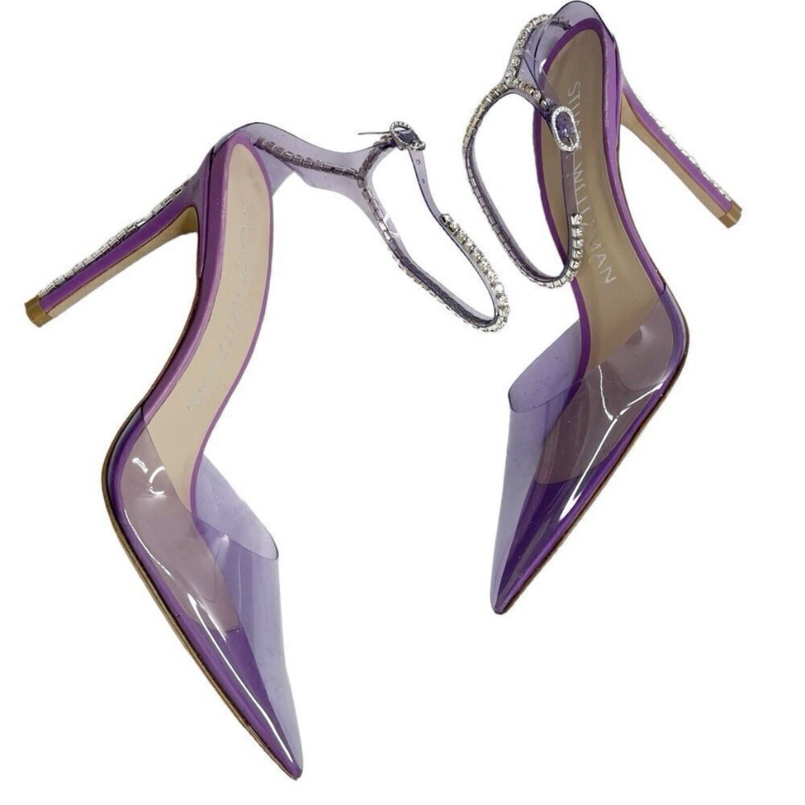 These Stuart Weitzman Glam heels feature a clear PVC design with embellished ankle straps and a sleek pointed toe silhouette. Brand: Stuart Weitzman Style: Glam Ankle Strap Pumps Size: Women’s Size 9 Color: Wisteria (light purple) Material: PVC upper, leather/TPU sole Features: Pointed toe, embellished strap, 4" stiletto heel, made in Spain Condition: Pre-owned; some missing embellishments and signs of wear. No box or dust bag. Please inspect all photos Style Tags: Evening Heels, PVC Trend,Ankle Strap, Glam Party Shoes, Designer Pumps