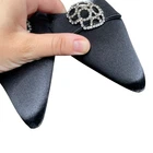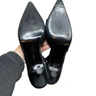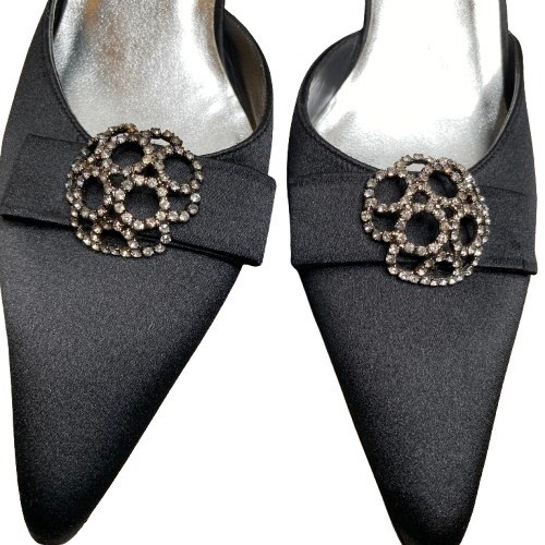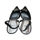 Very Good Pre-Owned Condition (see pics for details). Some minor wear on the bottom of toe area - see last 5 pics. Refined elegance defines these stunning Stuart Weitzman slingbacks, a perfect blend of classic design and subtle ornamentation. Imagine yourself gliding across the dance floor in these sophisticated heels, the sleek silhouette accentuated by a delicate, jeweled embellishment that catches the light with every step. The pointed toe elongates the leg, while the slender heel offers a comfortable lift. Picture them paired with a chic cocktail dress for an unforgettable evening, or adding a touch of glamour to a tailored suit for a confident professional look. Equally suited for a sophisticated wedding or a special date night, these shoes are a timeless investment in your wardrobe. Satin fabric upper Synthetic insole Leather outsole Adjustable slingback strap Sparkly diamond-like embellishment on bow detail Approximate 3" heel height Made in Spain Style profile - semi-formal, party, cocktail, wedding, glam, glamor, dressy, black tie We are happy to answer any questions! We ship the next business day!