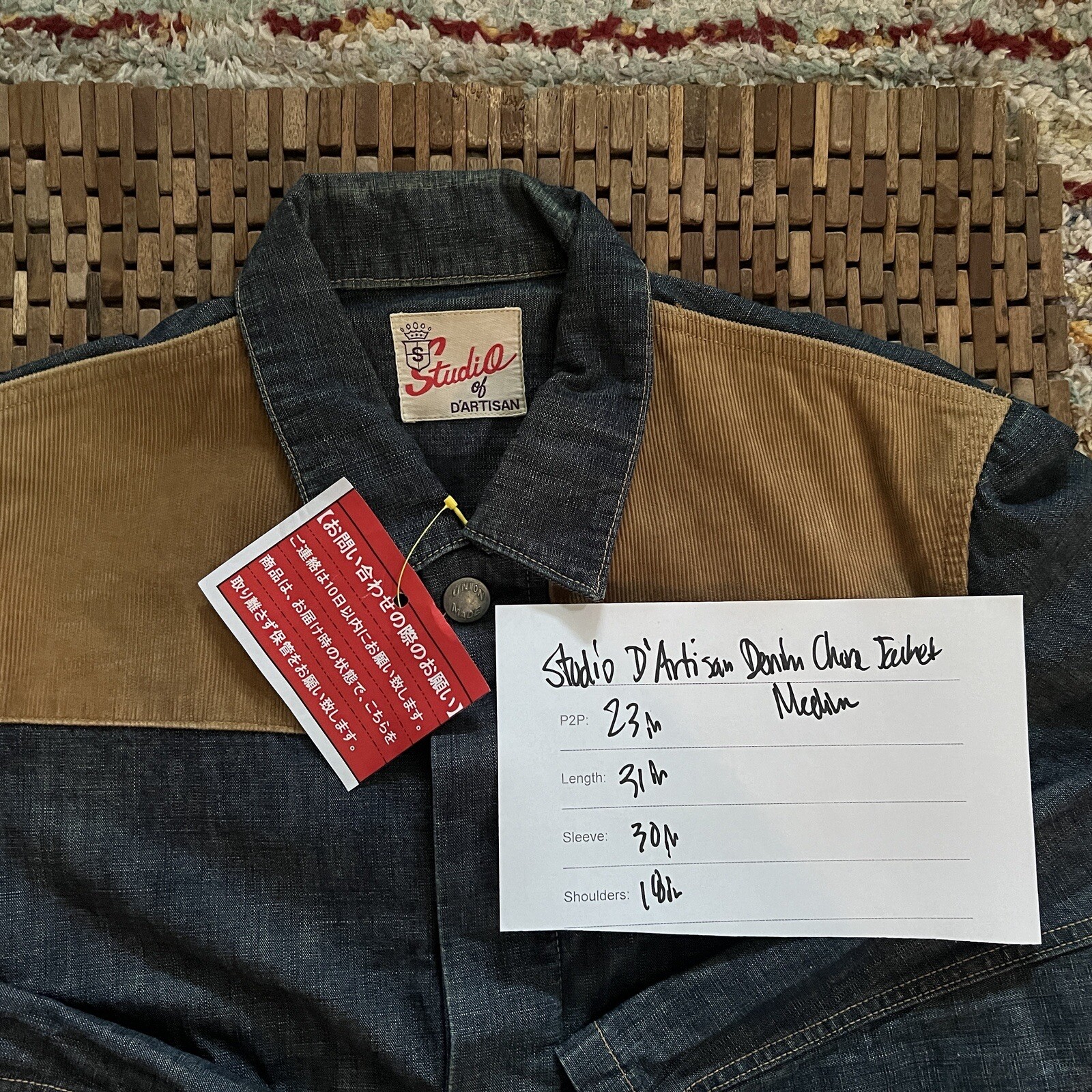 This Studio D'Artisan Osaka Chore jacket is a stylish addition to any wardrobe. Made in Japan with denim fabric, it features a solid pattern and button closure. The lapels and button-down collar add a touch of sophistication, making it suitable for both casual and business occasions. The jacket comes in a size medium and is blue in color. It has pockets for convenience and is unlined for a lightweight feel. This limited edition, organic piece is perfect for those who appreciate vintage-themed clothing. Get your hands on this unique piece today!