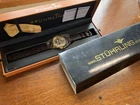 Stührling Original Cal. ST-90050 Men's Watch. Unworn/like new, plastic coat and back sticker still on. Selling as “used” just because the outer box is a bit damaged on the edges. A pristine and elegant timepiece with a striking gold colour, Krysterna crystal and fantastic crown. It comes with its original box and papers, as well as a Stührling branded wipe-cloth for polishing your watch surface. Perfectly working automatic movement inside can be seen through the exhibition caseback.