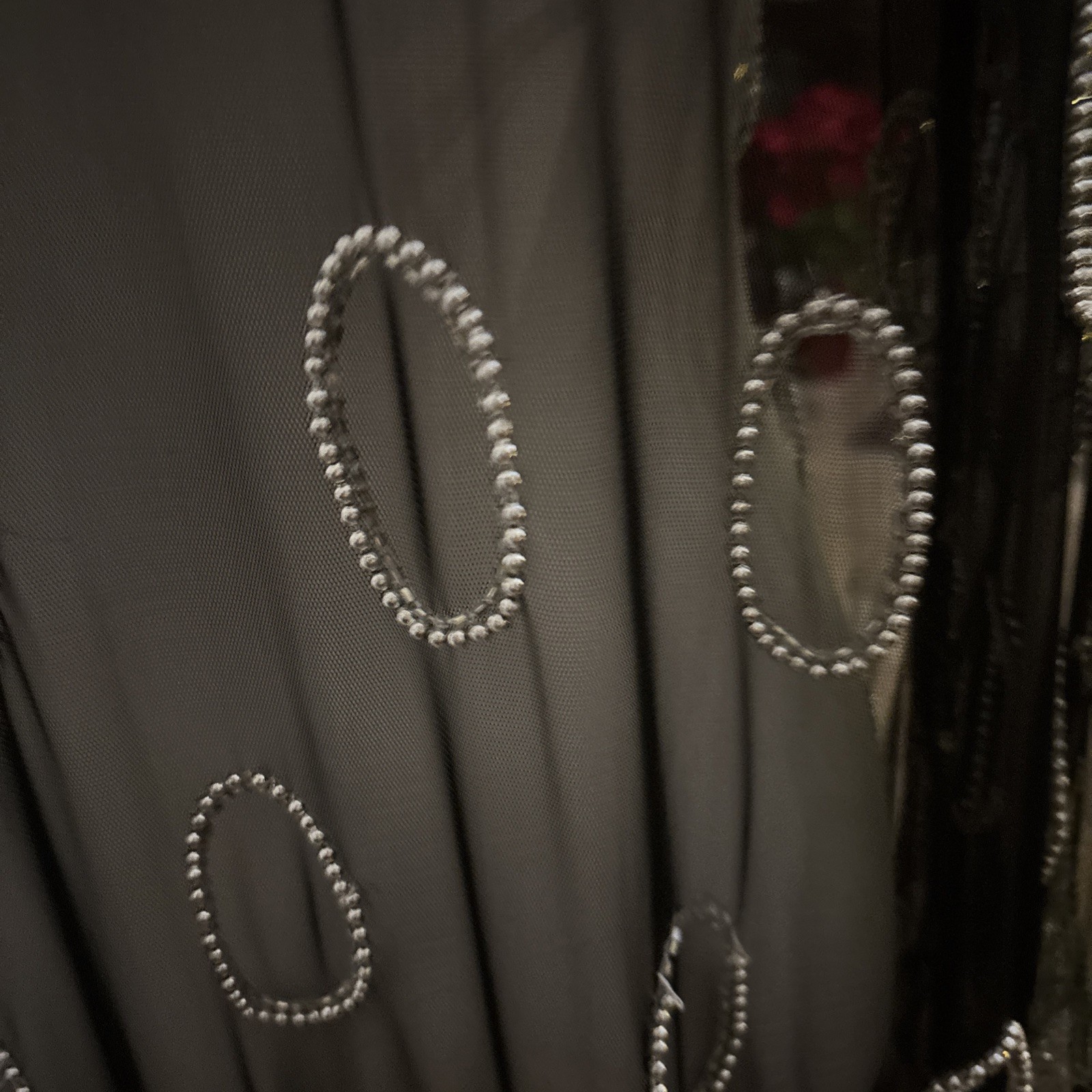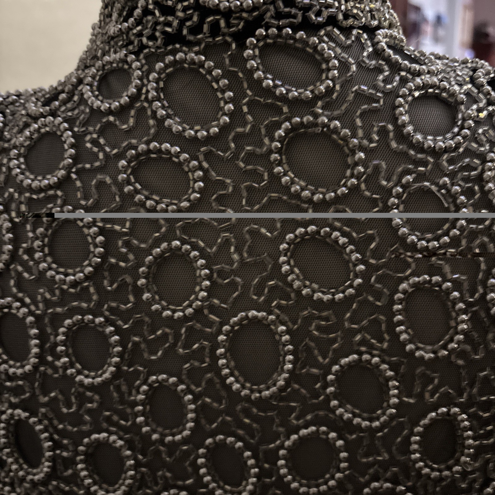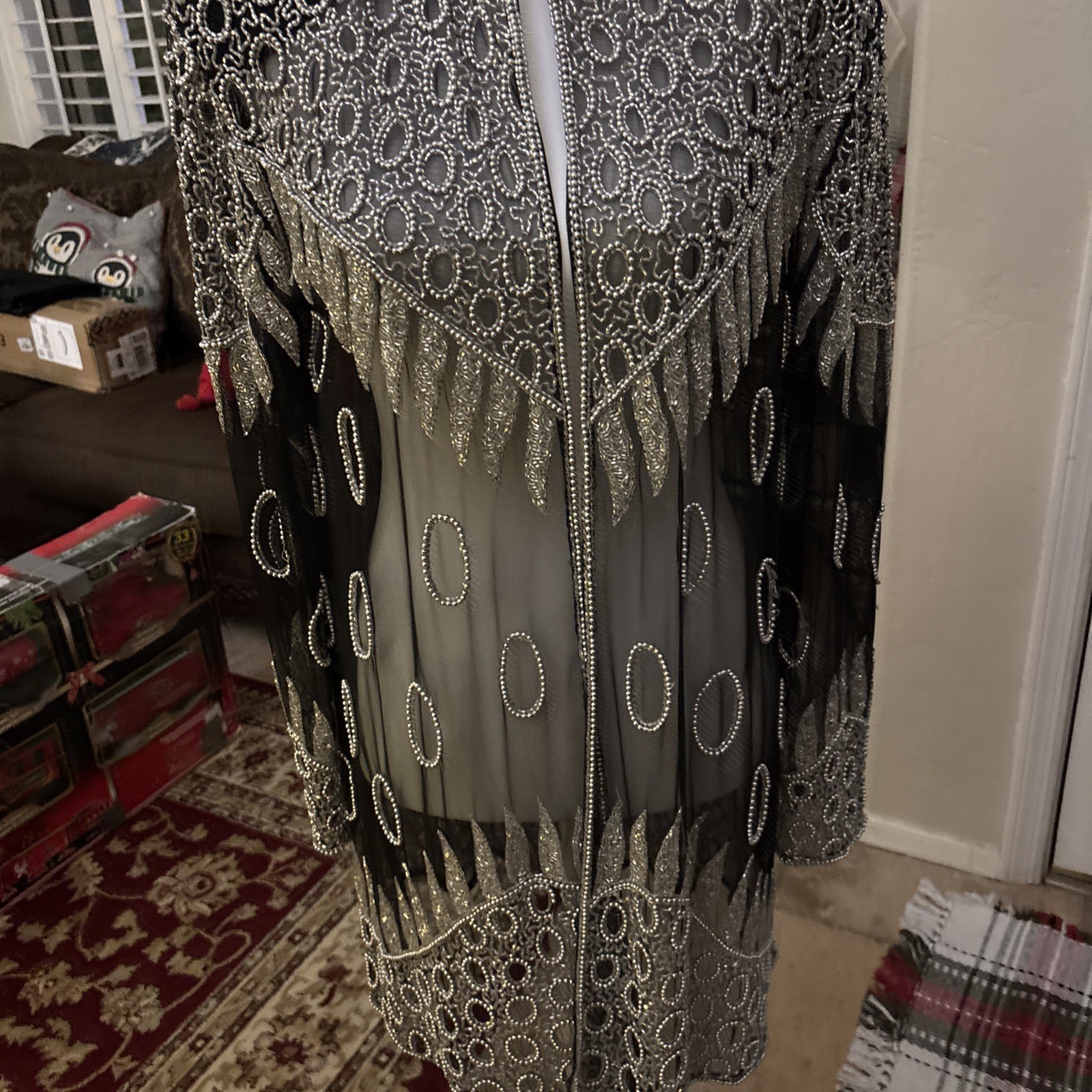 This stunning hand-made beaded evening jacket in silver and black is a perfect gift for any special occasion, especially Christmas. Crafted from 100% silk, the mid-length jacket features a classic long sleeve design, making it a chic choice for parties and cocktail events. The intricate beadwork adds a touch of vintage elegance to the jacket, which is available in size L with a regular fit. Made by hand, this jacket is a unique and stylish addition to any woman's wardrobe, suitable for the winter, fall, and spring seasons.