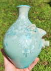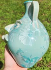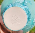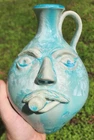 This is a one-of-a-kind Phil Morgan face jug with a stunning crystalline pattern. The blue jug is made of high-quality clay and has a glossy finish. It measures 8.25 inches in height and has an incised backstamp. The jug is handmade and vintage, originating from North Carolina. It is perfect for serving cigars or any other beverage of your choice. The jug is an original, licensed reproduction, making it a valuable addition to any collection. This is the only Phil Morgan crystalline glazed face jug I've seen with a cigar. The blue to white transition on this jug is subtle, but beautiful.