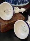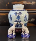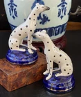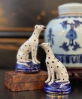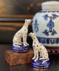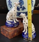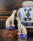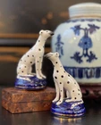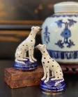 Marvelous Rare Authentic Original English Staffordshire Dalmatian Fox Hunt Hound Figural Mantle Dog Pair • Wonderful Antique Original Pair Dating from as Early as 1914 • Height 4” • Diameter of Base 2.25” • Length 2.75” • Gallery Quality Examples This diminutive rare semi-recumbent pair of antique English Staffordshire dalmatian mantle dogs is hand painted featuring fine willowy black and white spotted coated dalmatians that are seated upon round cobalt bases and looking slightly upwards, will bring a touch of the English countryside to any setting in which it is placed. This precious pair of miniature right and left facing figures will bring balance and symmetry when arranged on a mantlepiece, shelf or table and are sized in a perfect tiny scale to present an enchanting display. Rarely found petite models and entirely intact, even more rare. Minimal expected post-production wear. Stunning and superb English Staffordshire models to treasure and enjoy. Marvelous surviving examples. Display ready. Height 4” Diameter of Base 2.25” Length 2.75”