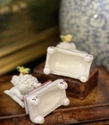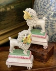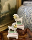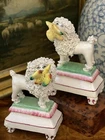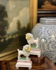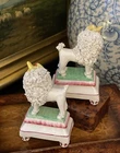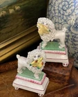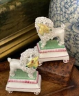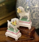 Stunning Diminutive Extremely Rare Antique 19C English Staffordshire Textural Mantle Dog Pair Gently Carrying Retrieved Birds in Their Mouths • Height 4” This rare pair of right and left facing diminutive antique royal hunt mantle dogs in classic form and carrying retrieved bird gifts gently in their mouths for their owners will bring a touch of the English countryside to any setting in which it is placed. This superb pair is certain to bring timeless elegance to any decorative setting, with each figure possessing its own endearing personality in abundance. Enchant every admirer with these marvelous period examples that are certain to fascinate and delight. Perfect placed front and center on their own as a delightful focal point, or as the piece de resistance in a collection or arrangement. Incredible surviving gallery quality models to enjoy and treasure. Superb. * Listing is for pair of textural dogs only. Other items for display purposes. Height 4” Length 2.75”