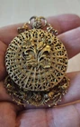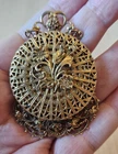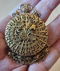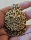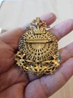 This stunning Victorian style brooch locket/pendant is perfect for displaying two pictures. The beautiful gold color and intricate design make it a great addition to any jewelry collection. It is a great choice for those who appreciate vintage jewelry and want to add a touch of history to their collection. This brooch is perfect for fashion lovers and is sure to make a statement. Don't miss out on the chance to own this unique piece!