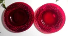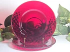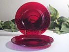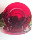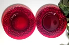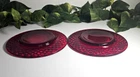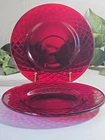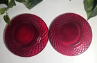 Elevate your dining experience with these vintage Ruby Red Diamond patterned glass salad/dessert plates. Each plate measures 7.5 inches in diameter, perfect for showcasing your favorite greens or sweet treats. Crafted from glossy ruby glass, these pieces are a stunning addition to any table setting, capturing the essence of mid-century modern style. The plates hail from an era of exquisite design and craftsmanship, the mid 20th century, and boast a timeless diamond theme. Although unmarked, the quality and allure of this two-piece set is undeniable, making it a suitable choice for all occasions. To maintain their luster, hand washing is recommended. Add a touch of vintage elegance to your home with this Ruby Red salad plate set.