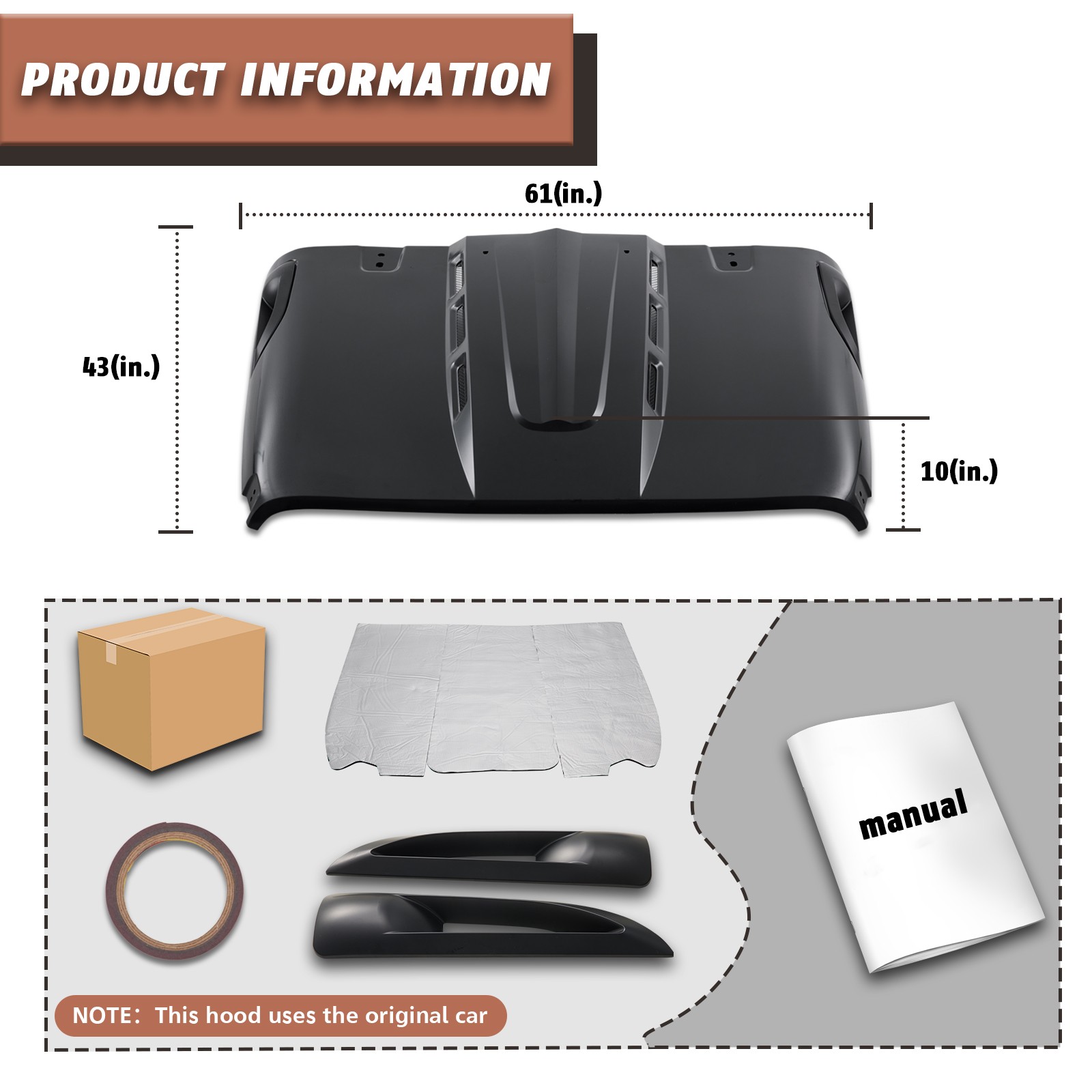 Suitable for 2018 2019 2020 2021 2022 2023 2024 Jeep Wrangler JL & JLU | Gladiator JT 2020-2024, compatible with both 2-door and 4-door Made from 20-gauge (1/32 inch) steel, the hood surface treated with an electrophoretic process and can be DIY'd in any color of your choice, it provides rust resistance and also serves to protect the surface 8 air vents to facilitate rapid heat dissipation, ensuring your engine bay maintains an optimal working temperature. The hood fits seamlessly with the original vehicle, featuring easy installation without the additional drilling, perfectly matching the existing mounting holes The product dimensions are 61x43x10 inches, with a weight of 43 lbs. The packaging dimensions are 64x45x10 inches, with a total weight of 60 lbs. Includes all necessary screws Package Contents: Includes 1 x Steel hood, 2 x Side vents, and 1 x Under hood insulation. We provide detailed installation instructions and offer professional technical support. If you have any questions or need assistance, our team is always ready to help On Sep 22, 2025 at 23:45:26 PDT, seller added the following information: