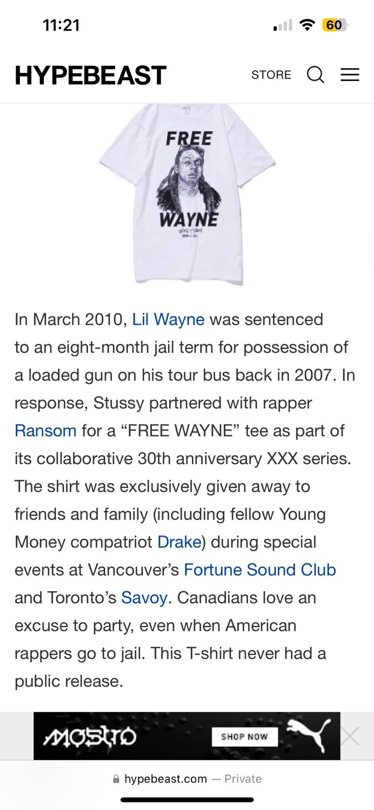 The product is a Stussy Free Lil Wayne t-shirt in size XL, released as a Young Money Friends & Family exclusive. This white cotton shirt features a solid pattern with short sleeves and a logo accent. With a regular fit and machine washable care, this t-shirt appeals to a wide range of themes including hipster, USA, biker, music, grunge, band, classic, 80s, 90s, hip hop, and sports. Perfect for fans of Lil Wayne and those who appreciate a unique and stylish addition to their wardrobe. Very minor spot on front Article via Hypebeast.com. Super Rare Size and Shirtless