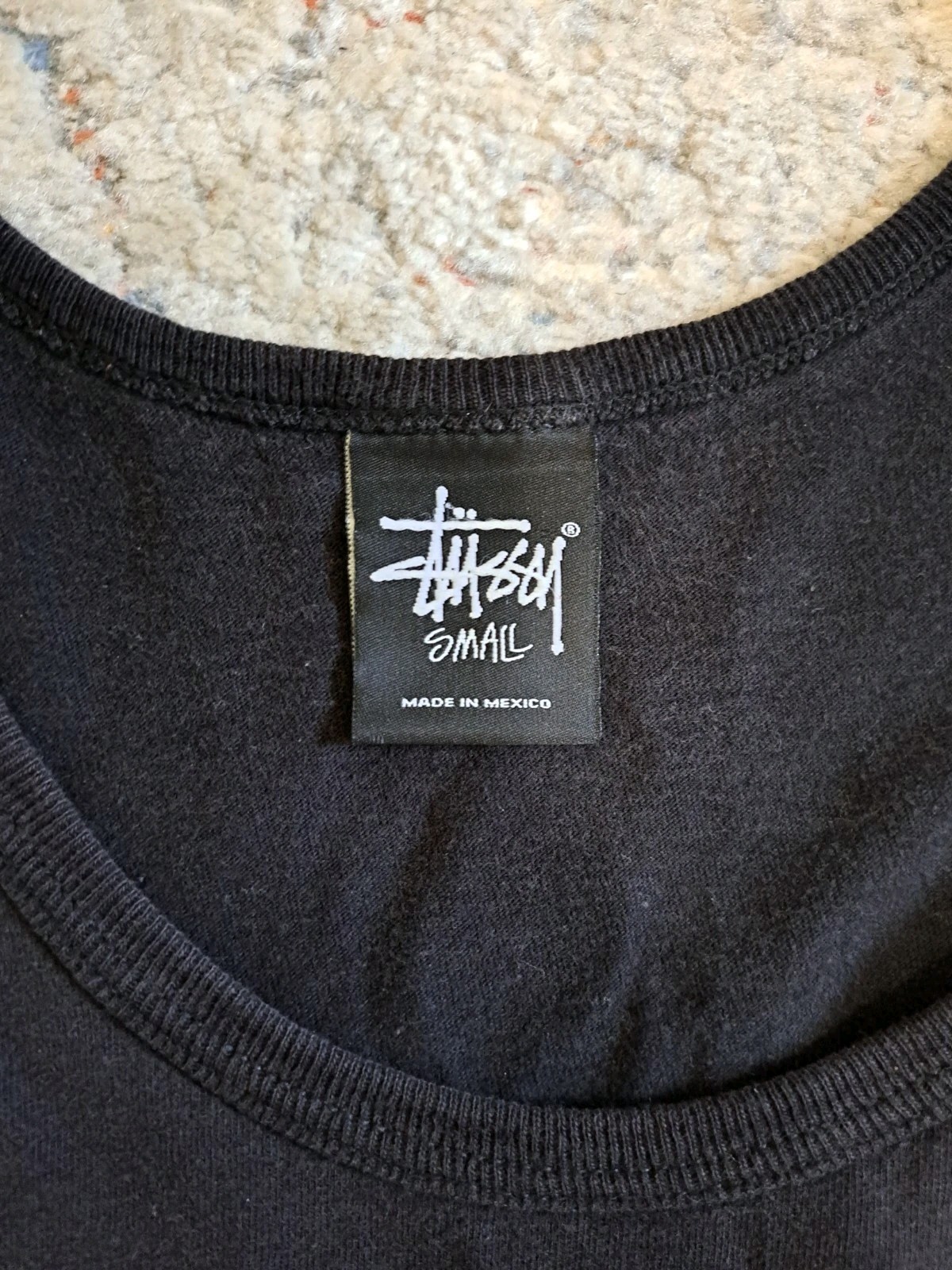 The Stussy T-Shirt is a men's small sleeveless t-shirt in black with a solid pattern. It features an angel character design on the front, representing the brand's connection to hip hop culture. Made with a round neckline and regular fit, this graphic tee is perfect for fans of streetwear and urban style. Designed in Mexico, this t-shirt is a fashionable and edgy addition to any wardrobe, showcasing the unique fusion of New York, Los Angeles, Tokyo, and Paris influences in the brand's aesthetic.