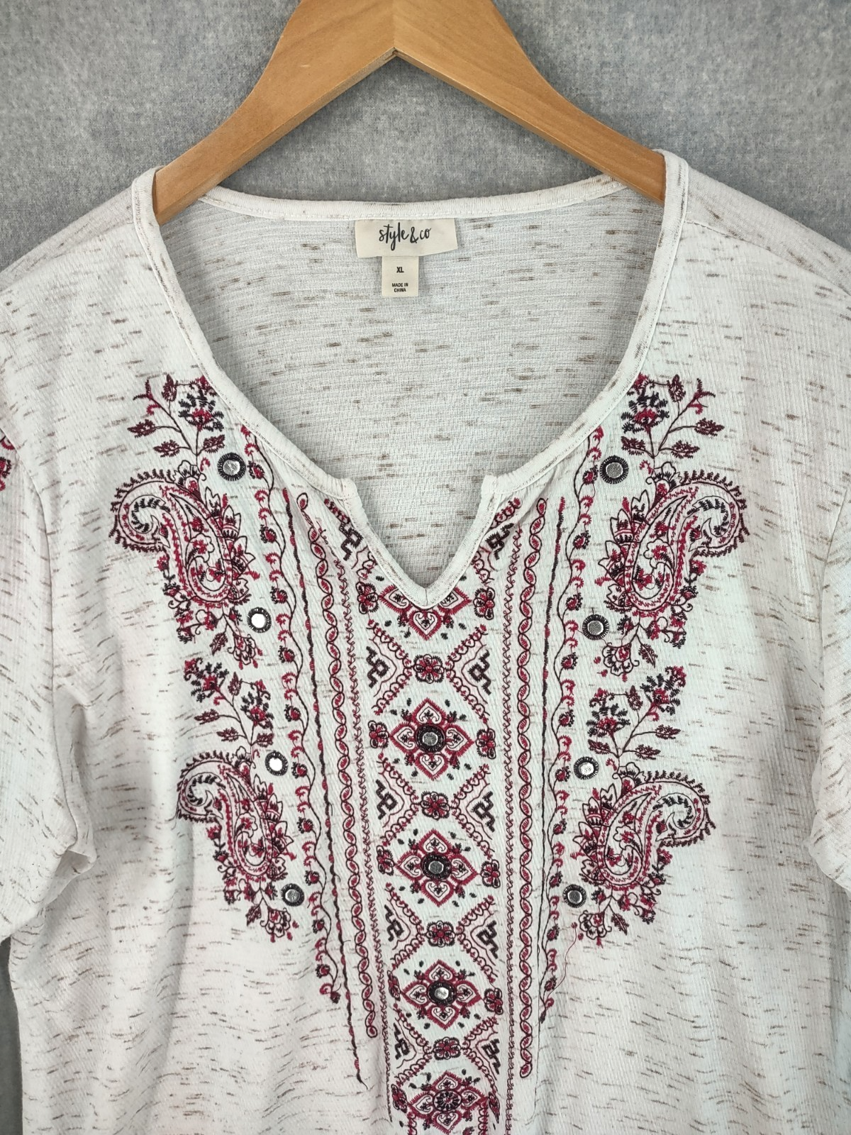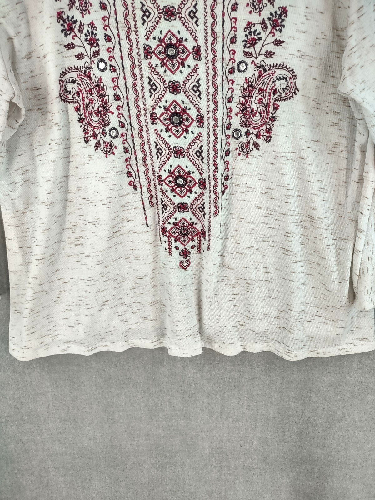 Welcome to Aspen Crossing, your destination for modern western bohemian style reflecting the rugged beauty of our American West. Style & Co Top Women Extra Large Ivory Bohemian Embroidered Embellished Thermal Waffle Knit Long Sleeve Bell Cuff V-neck Pullover Relaxed Fit It is always best to compare the measurements above with a top that fits you comfortably. CONDITION - Excellent pre-owned condition. All items are cleaned per EBAY standards. Not spot treated. See the photo gallery to view this items measurements and condition. SHIPPED - USPS First Class Mail unless item weight requires priority mail. RETURNS accepted, must be returned within 30 days in original condition to receive a full refund. SHIPPING AND HANDLING We ship all packages within five business days Monday through Friday except Holidays. Consolidated shipping is available for multiple purchases. Thank you for helping our planet and buying previously owned and loved items. I am grateful for your business. Enjoy! Check out our eBay store and follow us. There are new listings daily. CUSTOM SKU: Disclaimer: While we make every effort to capture the most accurate depiction of every item when photographing, colors may vary from screen display to in person therefore we cannot guarantee exact shade on any item. Message us if you have questions.