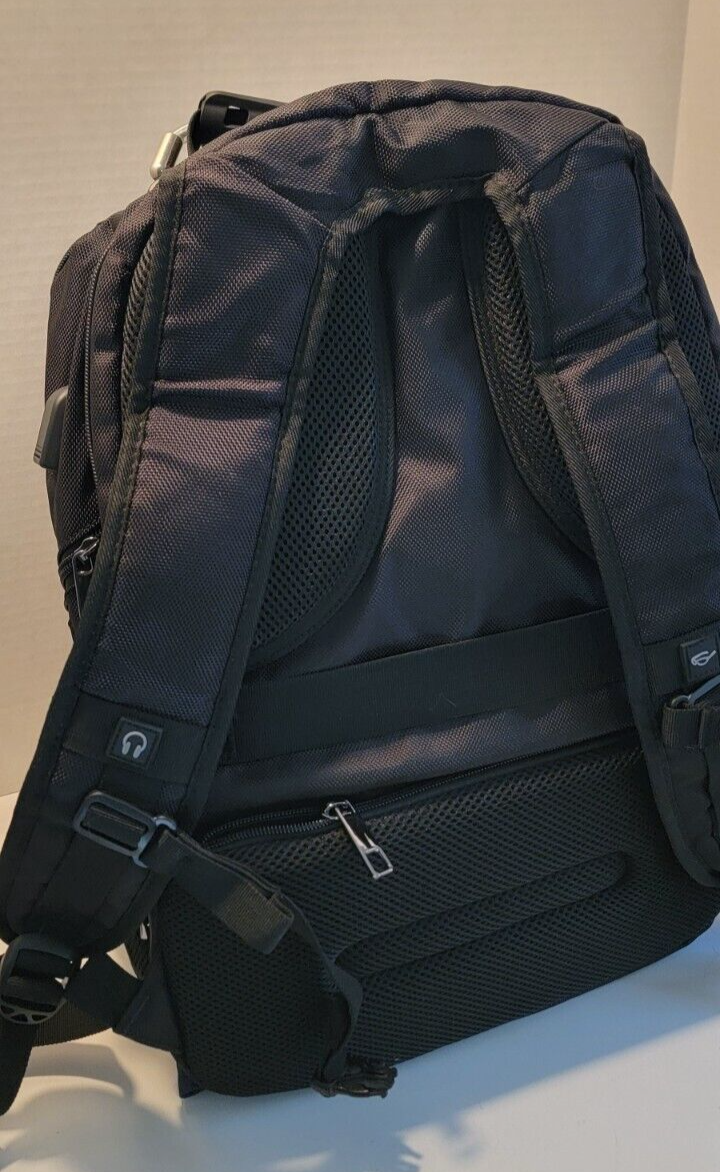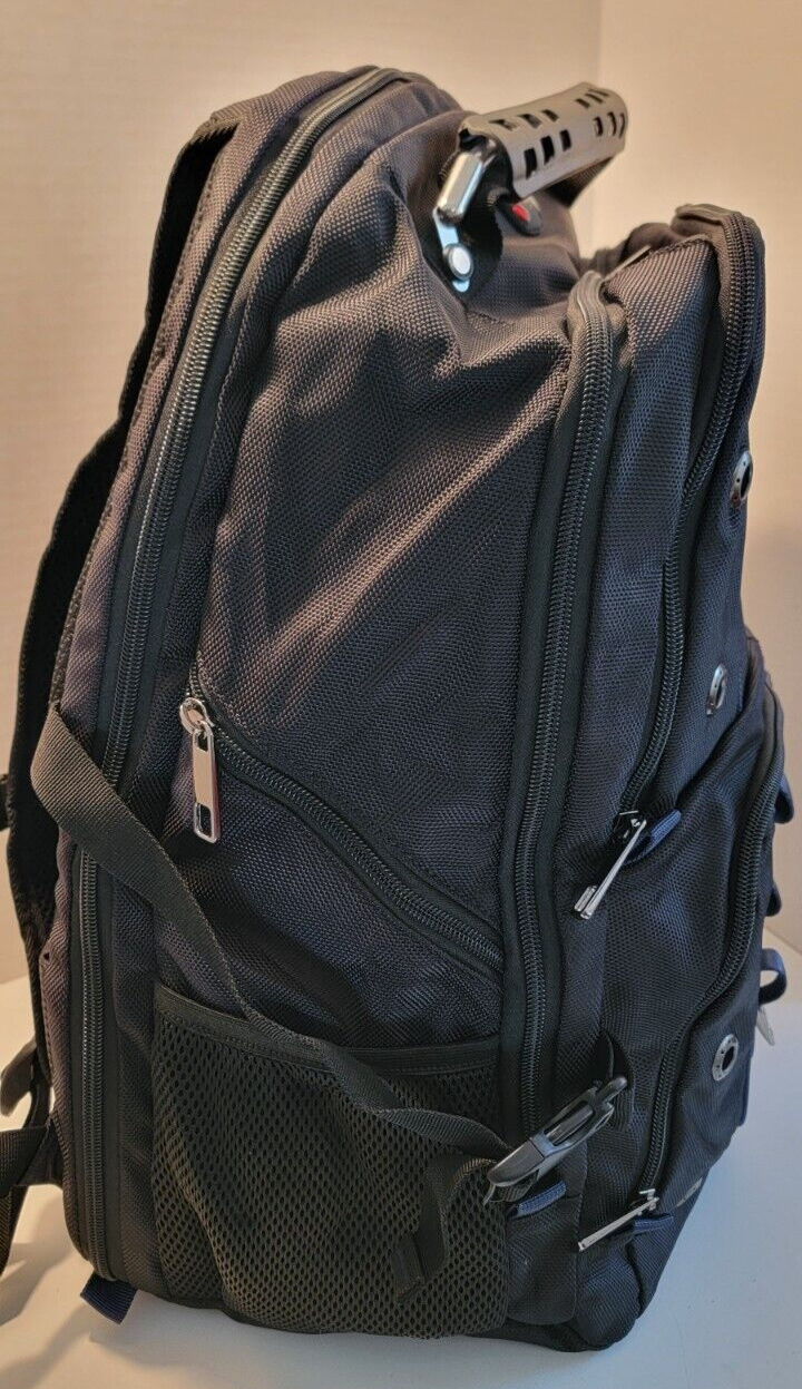 Travel Laptop Backpack 17.3 In Extra Large Capacity College bag Black Blue Trim Looks to be brand new but cannot say 100%. It still has the plastic protector on the brand tag. Large capacity and organized: men travel backpack owns 20 independent pockets for large storage and organization for small items. 3 spacious main multi compartments with many hidden pockets can accommodate lots of stuffs like 2 laptop, travel accessories, clothes, stationery, cord organizer, side deep Zipper pocket for Easy access essentials, side Elastic net pockets conveniently hold travel gear umbrellas or water bottles. Ideal bag backpack perfectly RFID POCKET TSA FRIENDLY: The anti-thief back pocket with RFID blocking can protect your personal information from being stolen (e.g. credit cards, passports, and driver's license). Tsa approved and multipurpose: at Checkpoint, unfolds the extra large backpack 90 180 degree making you quickly through the airport security and keep items tidy, exclusive designed for airplane traveling. The big backpack is perfect for indoor outdoor activities.Served as large backpack Practical and convenient: external USB port with set-in charging cable offers convenient charging your cellphone and other electronic devices everywhere. A hole for headphone outside gives easy access to Earphone usage. Also, the 17.3inch backpack with a sturdy rugged handle with steel cable on the top for carrying, side compression straps keep the exclusive backpack at whatever size you requires. As a men women's backpack, you will enjoy It's fashionable, comfortable and convenient everywhere EXTRA LARGE MATERIAL: Size of extra large backpack: 19. 0x14. 6x10. 2 (inches), Capacity: 45L, separate padded laptop compartment hold for 13, 14, 15, 15. 6, 17 and up to 17.3 inch Laptop backpack/computers for adults, women, men and teacher. The scan smart laptop backpack made from polyester fabric shockproof with high density nylon lining for better TEAR and WATER RESISTANT and heavy duty backpack XL laptop backpack Comfortable: Tech backpack with back U shaped three dimensional ventilation design help for the air convection, ventilation and heat elimination. Comfortable wide breathable mesh shoulder straps with plentiful sponge pad help relieve the stress from your shoulder. Both sides of the shoulder strap with lanyard design, can hang sunglasses and other small pendants. Premium Big bags for men Also computer backpack for women.And it is a ideal present for men women