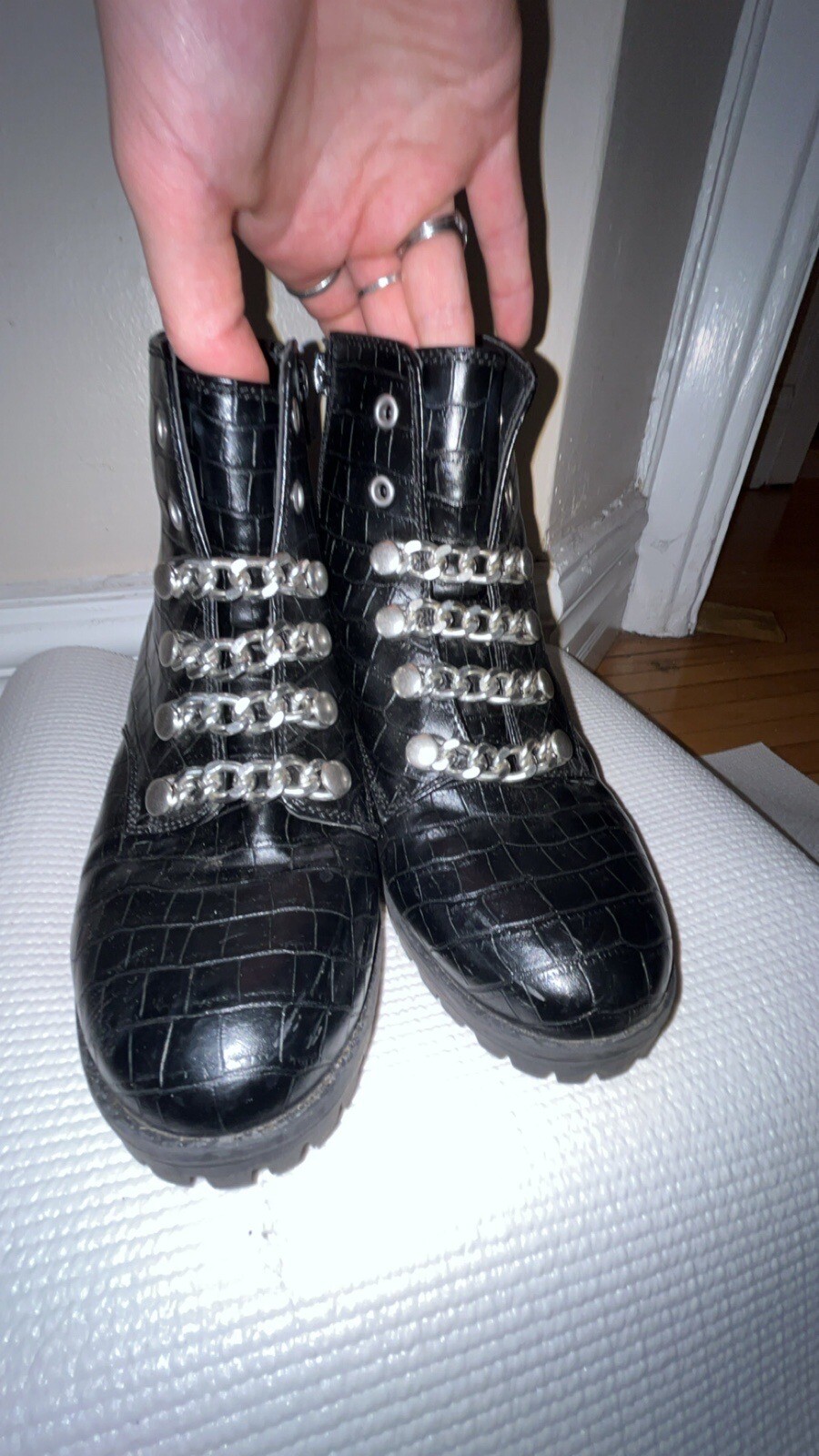 Elevate your shoe game with these stunning black ankle boots featuring silver chains and faux alligator leather. With embossed accents, these boots are the perfect addition to any wardrobe. The zip closure and block heel style make them comfortable and easy to wear for any occasion, whether it's a casual day out or a fancy event. The faux leather upper material and synthetic lining material provide durability and comfort. Don't miss out on the chance to add these stylish boots to your collection.