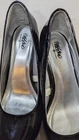 These MOSSIMO high heels are a stylish and versatile choice for any woman looking to add a touch of sophistication to her outfit. With a sleek black patent design and a comfortable slip-on closure, these platform shoes are perfect for both club wear and work attire. The medium-sized heel and slim heel style provide both style and stability, while the all-man-made upper material ensures durability. These shoes have minimal wear.