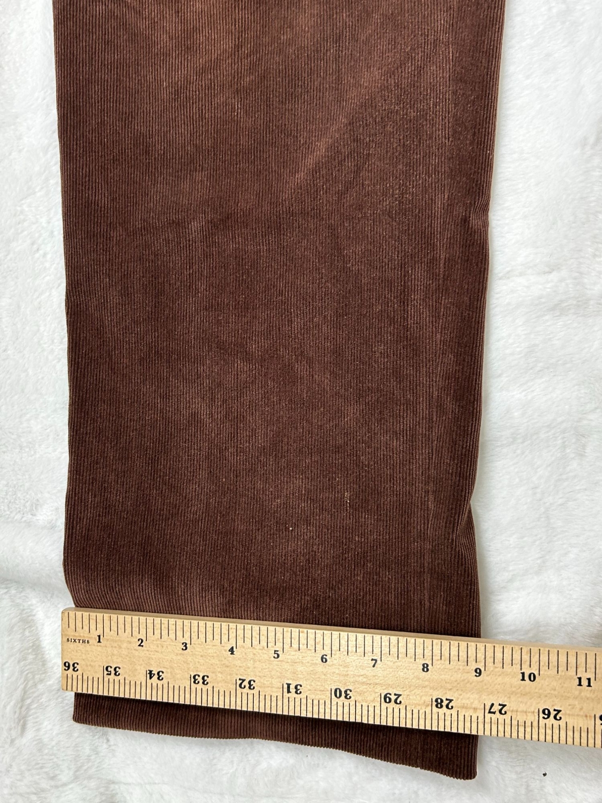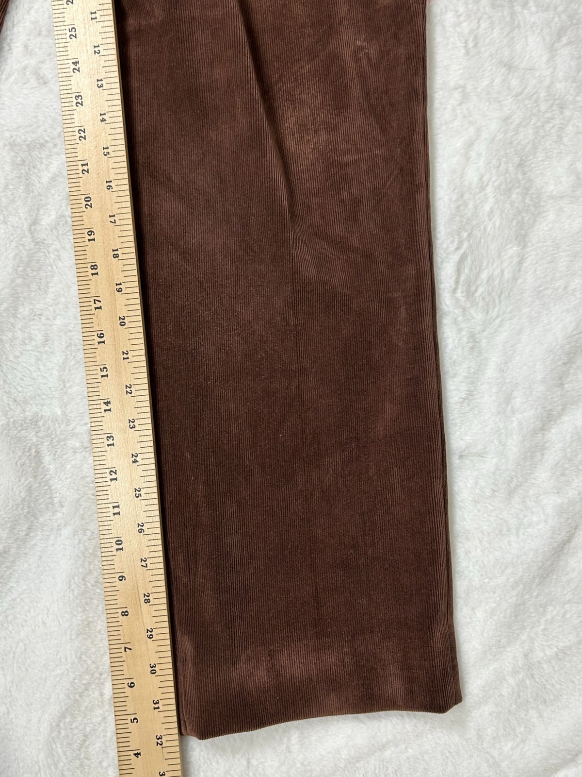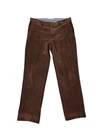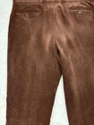 Crafted with a blend of polyester and elastane, these corduroy pants offer durability and flexibility. The design provides a refined and professional appearance. • Button closure with zip fly • Front and back pockets • Elegant corduroy texture • Made in Canada • Waist = 38 inches No visible flaws detected. Inseam = 31 inches, Leg opening = 8 inches.