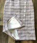 **Ivory Multi Karma Tweed Skirt by Halogen This Halogen pencil skirt is a stylish addition to any wardrobe. The skirt is made of tweed and features a plaid pattern in multicolor. It has a mid-rise waist and a button closure. The knee-length skirt has a straight and pencil style, with a faux wrap design that adds a touch of elegance. Ideal for formal occasions, business meetings, weddings, and parties, the skirt is lined and has a slit for added comfort. The skirt is a size 4 and is perfect for women who like to dress stylishly without compromising on comfort. Made in Indonesia, this skirt is a must-have for any fashion-conscious woman who wants to look and feel her best.