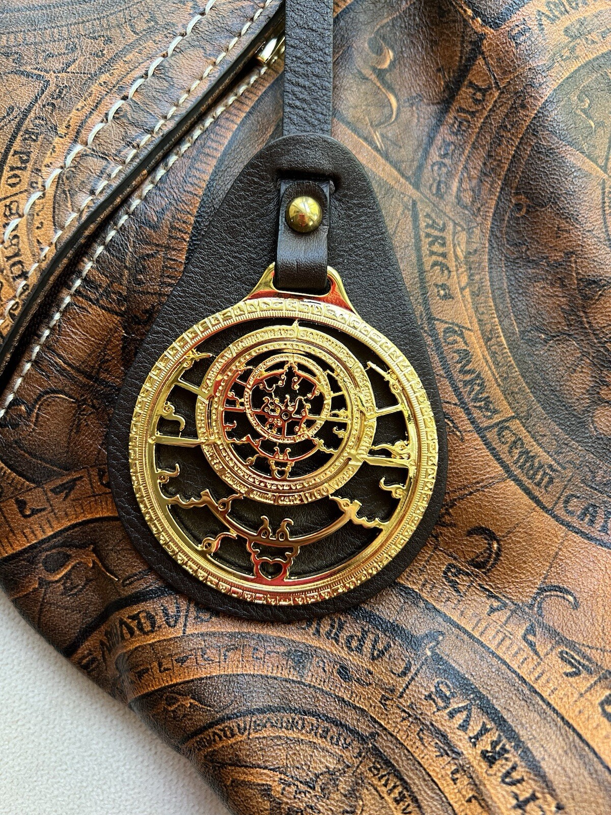 Luxury, stitch-finished bronze ASTRONÓMICA VERNICETTA shopping bag, artisan-made in Florence, Italy. 🇮🇹 Leather, printed astrolabe (instrument formerly used to make astronomical measurements, typically of the altitudes of celestial bodies) design, semi-gloss effect. Dimensioni 40X12X26 cm Size 40X12X26