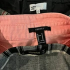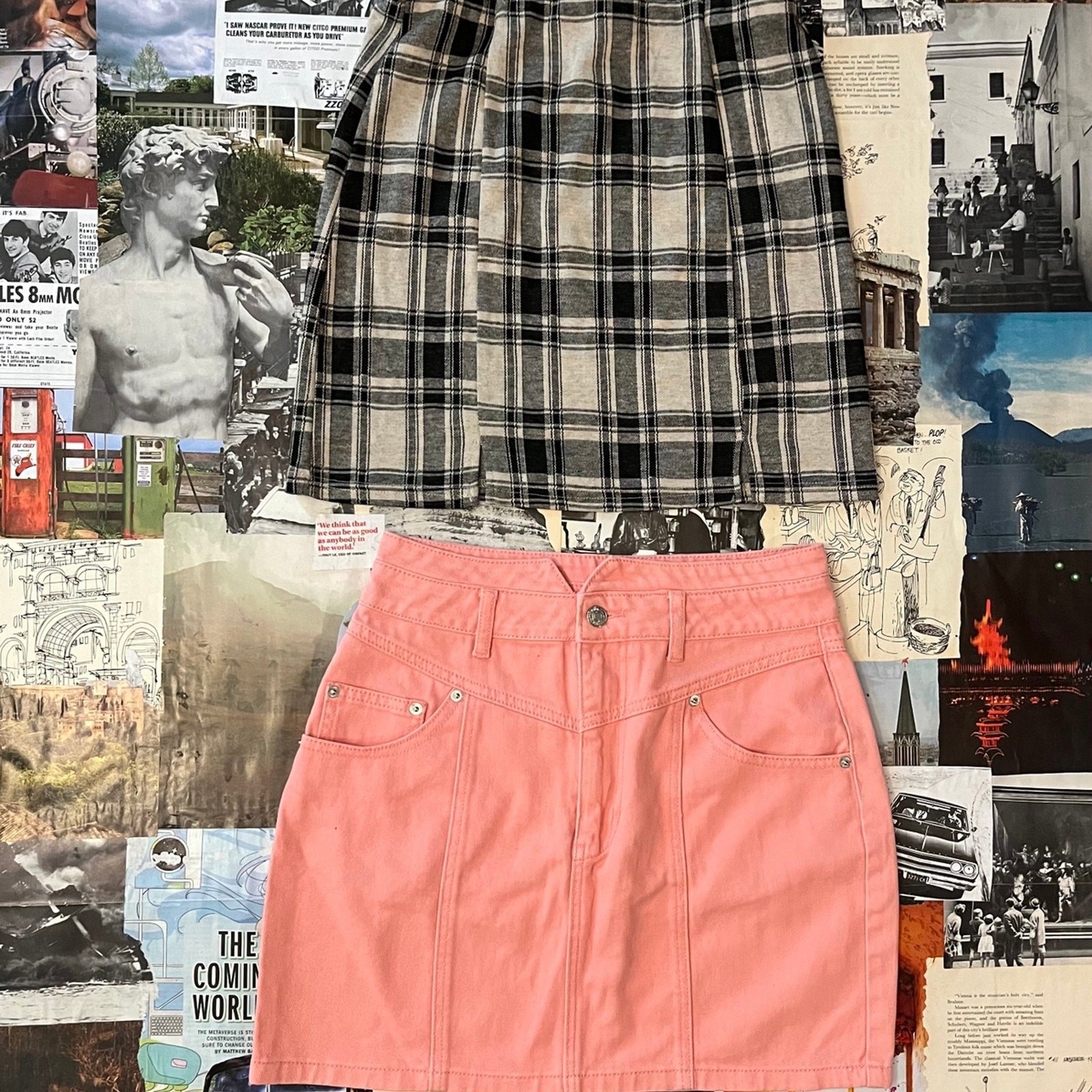 lot of skirts size medium the first is a tan and black plaid stretchy mini skirt the second is a peachy pink high waisted skirt the last is a red black and brown gingham skirt, it has small frill on the bottom and zips up