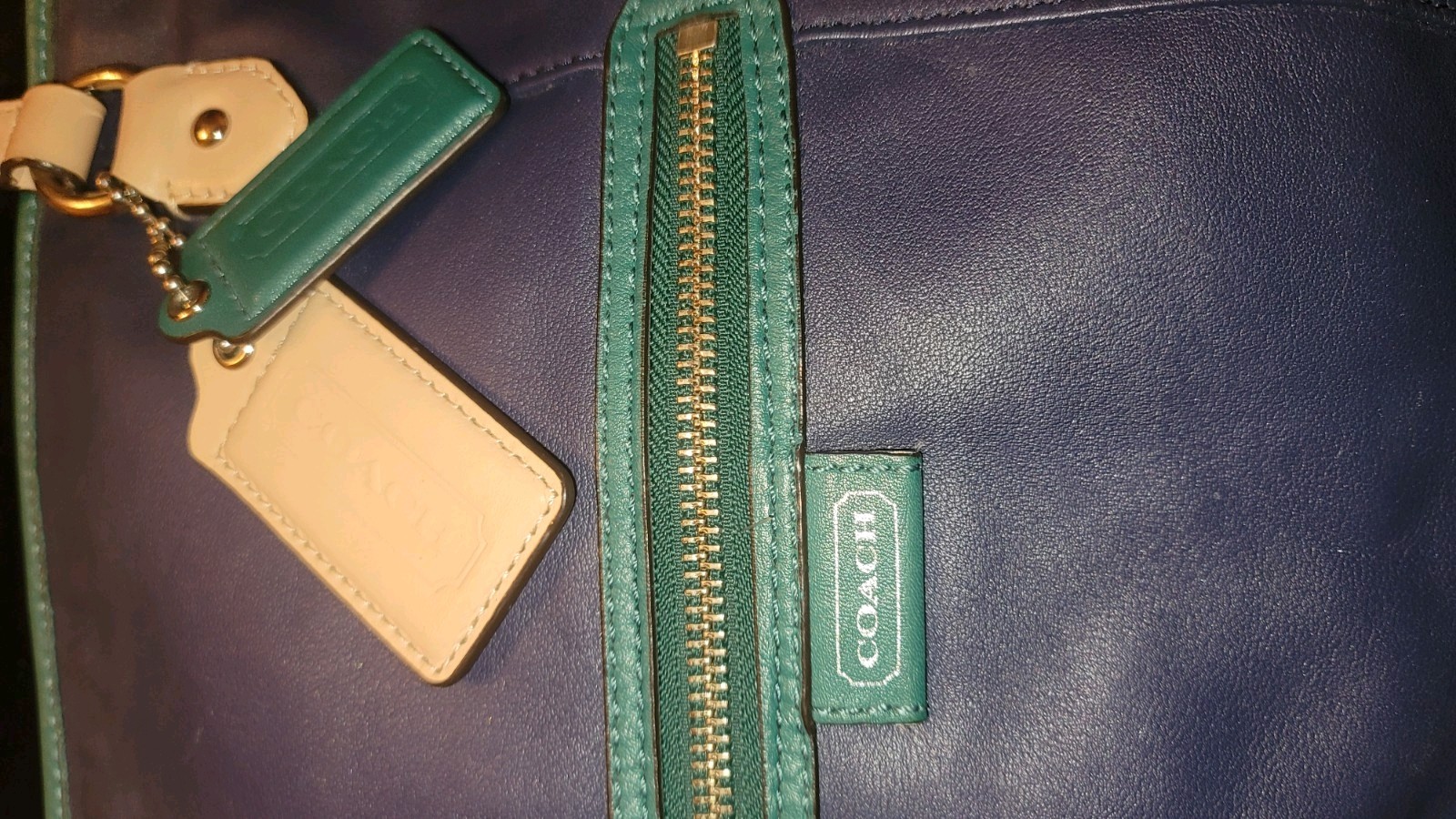 Gorgeous navy and green Coach crossbody/handheld handbag designed for women. Made from leather, this stylish shoulder bag exudes elegance and sophistication. It features the iconic Coach branding, making it a fashionable and functional accessory for any outfit. Perfect for carrying essentials while on the go, this handbag combines quality craftsmanship with a chic design that is sure to make a statement.