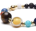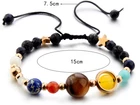 Eight Planets Solar System Bracelet – A Masterpiece of Design and Healing Explore the cosmos with our stunning Eight Planets Solar System Bracelet , a thoughtfully crafted accessory that combines the beauty of natural and synthetic crystal healing stones. This bracelet offers not just style but also a sense of calm and relaxation, enhanced by the grounding properties of black lava stones. Key Features: Planetary Design: A unique combination of solar planets, stars, and lava beads create a celestial aesthetic, making it feel like the universe is encircling your wrist. Adjustable Fit: Features a pull-cord design, adjustable from 6.7 to 10.6 inches , ensuring a comfortable fit for all wrist sizes. High-Quality Materials: Lapis Lazuli (Faux): 8mm Skye Blue Dyed Jade: 8mm Dyed Yellow Jade: 8mm Tiger Eye: 12mm Dyed Red Jade: 6mm Synthetic Blue Sea Sediment: 8mm Synthesis Opal: 4mm Copper Beads: 4mm White Jade: 6mm Synthesis Blue Sand: 5mm Lava Stone: 7mm Lava Stone Aromatherapy: The black lava stone acts as a natural diffuser for essential oils. Add 1-3 drops of your favorite essential oil to the stone and enjoy its calming effects while promoting intense inner peace and balancing your root chakras. The root chakra is vital for life energy, endurance, and a connection to nature. (Please ensure you’re not allergic to the oil before use.) Natural Variations: Each bracelet is unique , with bead colors and patterns varying slightly due to the natural and handcrafted nature of the materials. Stones may feature cracks and inclusions, a testament to their authenticity. Care Instructions: Remove before bathing or showering to prevent tarnishing or damage. As with all costume jewelry, avoid constant wear. Weeks of wear can lead to an oil buildup; regular cleaning is recommended to maintain its brilliance. Why Choose This Bracelet? This Eight Planets Solar System Bracelet is more than just jewelry; it’s a harmonious blend of design, symbolism, and healing energy. Whether you’re looking to calm your mind, balance your chakras, or simply wear a piece of the cosmos, this bracelet is the perfect choice. Experience the universe on your wrist and elevate your spirit with this celestial treasure. All photos are copyrighted by eclectic shop uk ltd ®, and unauthorized use is strictly prohibited. The company takes pride in its images and prefers to use its own, spending time to maintain their quality. One item is supplied with each purchase. eclectic shop uk ltd ® and its logo are registered trademarks.