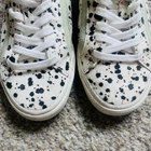 We designed our sneakers with the idea that shoes should be comfortable from the get-go. Made of spatter-painted calf hair with a touch of mint leather and a recycled cotton lining, these low-tops have MWL Cloudlift insoles for a supercushy, ultra-supportive fit that feels like walking on a...well, you know. When you select your size, "H" equals a half size. Do Well: Uses recycled pre-consumer cotton that could otherwise go to landfills. Leather, calf hair upper. Man-made sole. Black and white with green stripe on sides Dalmatian, cow, speckled, lighthouse multi Great pre loved condition. Super clean. Little to no wear.