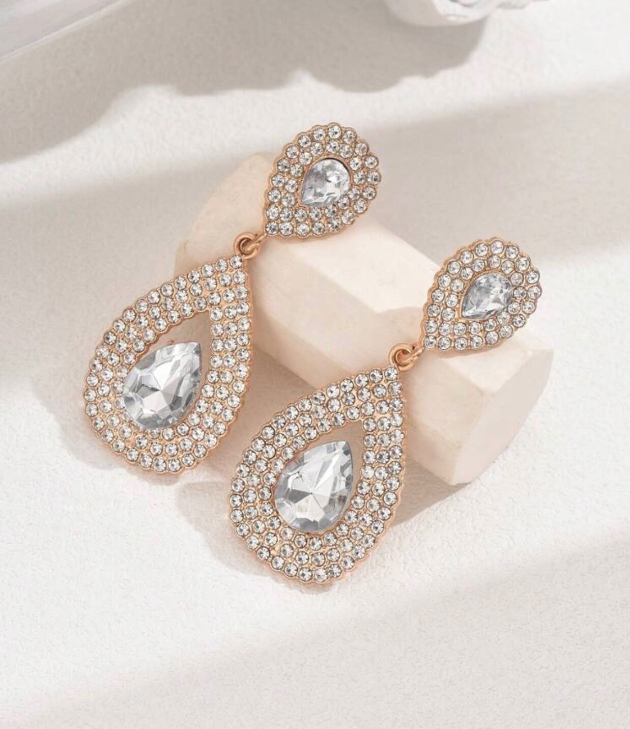 This stylish pair of earrings is designed for women, featuring a trendy water drop pendant style in a dazzling gold color. The earrings are made with rhinestone material, adding a touch of elegance and sophistication to any outfit. Perfect for adding a touch of glamour to both daily wear, gifts, party, wedding, these dangle/drop earrings are a versatile and chic accessory for any fashion-forward individual.