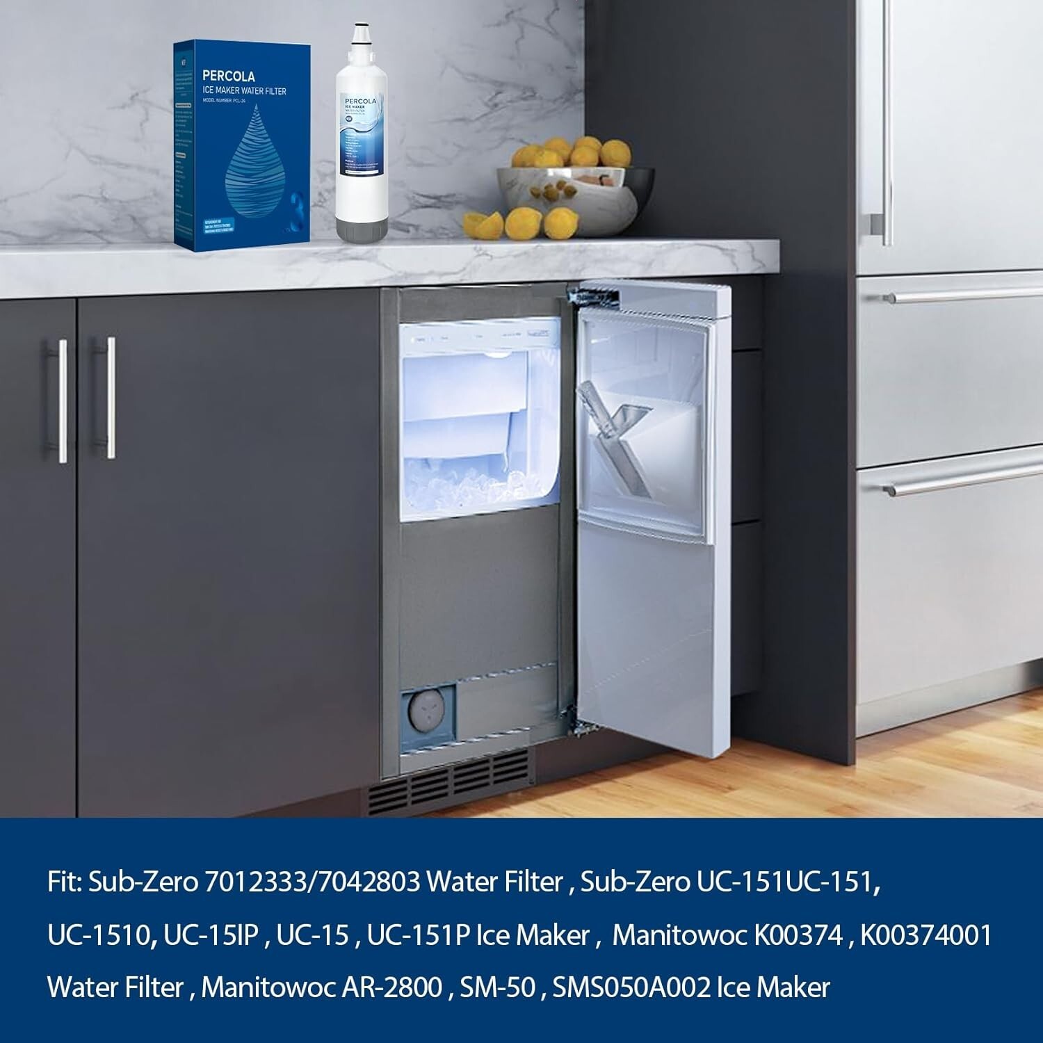 Sub-Zero 7012333/7042803 & Manitowoc K00374/K00374001 Ice Maker Water Filter, Compatible with Sub-Zero UC-15I Ice Maker, Manitowoc AR-2800/ SM-50 Ice Maker (3 Pack) Material Plastic Product Dimensions 2.36"D x 2.36"W x 9.76"H External Testing Certification REACH, NSF Product Benefits Reduces Turbidity Brand PERCOLA About this item Include 3 Filters: Fit Sub-Zero 7012333, 7042803 Water Filter, Sub-Zero UC-151, UC-15I, UC-15IO, UC-15IP, UC-15, UC-151P Ice Maker ; Manitowoc K00374, K00374001 Water Filter, Manitowoc AR-2800, SM-50 Ice Maker. Please release 3-5 gallons of water before use for better taste. Fresh and Clean Drinking Water: PERCOLA water filter reduces 99.5% of chlorine and lead, while inhibiting the growth of scale. The removal rate of suspended solids in water can reach more than 99%, such as sediment and chlorine flavor, chlorine odor and other impurities. No Noise and Easy Installation: Twist and lock designed. Saves your time and effort with tool-free installation. You will never worry that filters will leak water, damage your kitchen floor and make a wising noise when filtering water. It's recommended you to change your filter every 6 months/2800 gallons based on water quality and usage. Product Certifications:This PERCOLA 7012333/7042803/K00374 Ice Maker Water Filter offers excellent filtration performance and is standardized with NSF 42 certification. PERCOLA- We are always prepared for your safe drink! To reset the indicator,please press the CLEAN key pad for six seconds to reset the filter life indicator once the filter cartridge has been replaced.