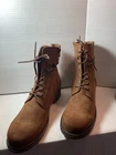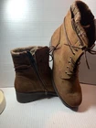 Step up your shoe game with these stylish and comfortable Cushionaire Memory Foam Lace Up Combat Boots in a beautiful brown suede material. These boots feature an almond toe shape, lace-up closure, and a low block heel with a height of 1-1.9 inches. The faux suede outsole and faux fur lining material make these boots perfect for the winter, fall, and spring seasons. These mid-calf combat boots have a medium calf width and a standard shoe width, making them a great fit for women's US shoe size 10. The zipper accents and ombré pattern add a touch of elegance to these boots, while the memory foam feature provides maximum comfort for all-day wear. Whether you're dressing up for a night out or running errands, these boots are the perfect addition to any outfit.