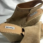 Not Rated brand suede peep-toe espadrille wedges in tan/neutral. Heel Height: Approximately 4 1/2 inches, with a 1-inch platform. The size 9 shoe is made of suede material and features a comfortable M width, making them a versatile and trendy choice for women's footwear. Adjustable Velcro ankle strap