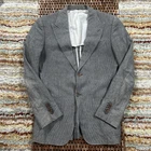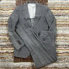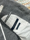 A men's two-piece suit by Suitsupply in size 38L. The suit features a collared neckline, a slim fit, a grey pure linen fabric, and a lined, pleated jacket with a notch lapel style and double-vented design. It has long sleeves, a 2-button front closure, and regular-length jacket and pants with a chest size of 40. The suit is suitable for all seasons and should be dry cleaned only. Top button is loose. Priced accordingly.