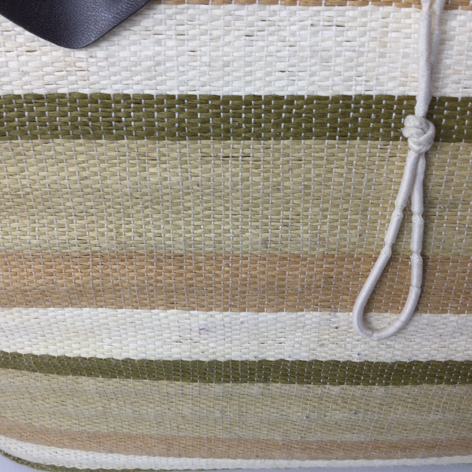 Summer Shoulder Bag Canvas Woven Basket with Handles Green Brown Stripes. 12" x 20" x 4". Top is open, with string and button for closer. Good condition, no holes. Bottom has some signs of using it. InvN/M/5