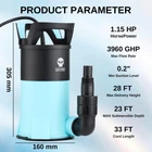 Powerful Flow : SainSsmart sump pump with a 1.15HP power motor drains water at up to 3960 gallons per hour. Featuring a powerful flow rate, it ensures efficient drainage even when the head is increased, and the flow curve drops Wide Applications: 1-1/2'' NPT discharge includes a 1-1/2'' elbow adapter, 3/4'' garden hose adapter, and 1" hose adapter, fitting 3/4'', 1'', 1-1/4'', or 1-1/2'' pipes/garden hoses. It's ideal for clean or dirty water, it’s perfect for draining hot tubs, water heaters, basements, gardening, and car washing High-Quality Materials: The water pump is made of thermoplastic material, reinforcing its durability and corrosion resistance. Equipped with a long power cord, it is easy to use in any corner Safety and Reliability: sump pumps are equipped with all-copper motors with overload and overheat protection to ensure stable performance and safety even after long periods of use Extended Continuous Operation: 850W submersible pump is built to handle prolonged usage without overheating, making it perfect for large-scale drainage tasks