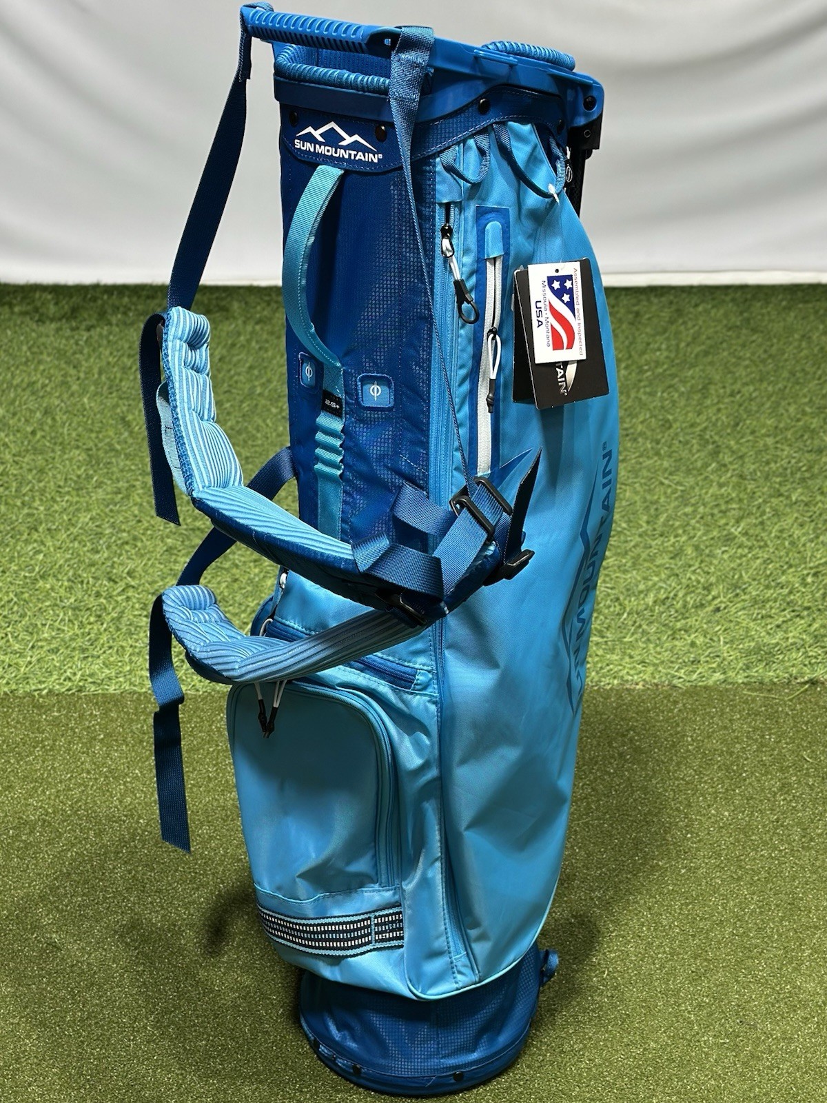 We are a reputable golf company that has been in business in St. Louis, Missouri since 1975. We have been doing this for 40 years because we do things right the first time. WE HAVE THE FASTEST SHIPPING ON EBAY! Don't believe us? Check out our Feedback. If you have questions, please feel free to ask. As always, thank you for looking. Sun Mountain 2.5+ Stand Golf Bag COLOR: Surf/River STYLE: Stand Bag DIVIDERS: 4-Way Divider CONDITION: NEW with Tags (10/10) RAIN HOOD: Included! 2.5+ Stand Bag Designed for the avid walking golfer, the 2.5+ redefines the features that can be offered in an ultralight golf bag. It has contoured, high-density foam shoulder straps for carry comfort, a roomy, 7.5" top and six pockets including a beverage pouch. All of this and it still weighs under three pounds. Features: Six pockets include a full-length apparel pocket; a velour-lined valuables pocket; a ball pocket with two-way zippers; a beverage pouch; and multiple accessory pockets Lightweight, high-strength-to-weight plastic top with a comfort-grip handle X-Strap System is easy to get on and off and works well as a single strap for short carries Four full-length dividers Integrated, comfort hip pad Ultra-lightweight, highly durable carbon fiber legs Matching rainhood included Top Width: 7.5" Pockets: 6 Strap Type: X-Strap Dual Strap System Dividers: 4 Bag Weight: 2.9lbs